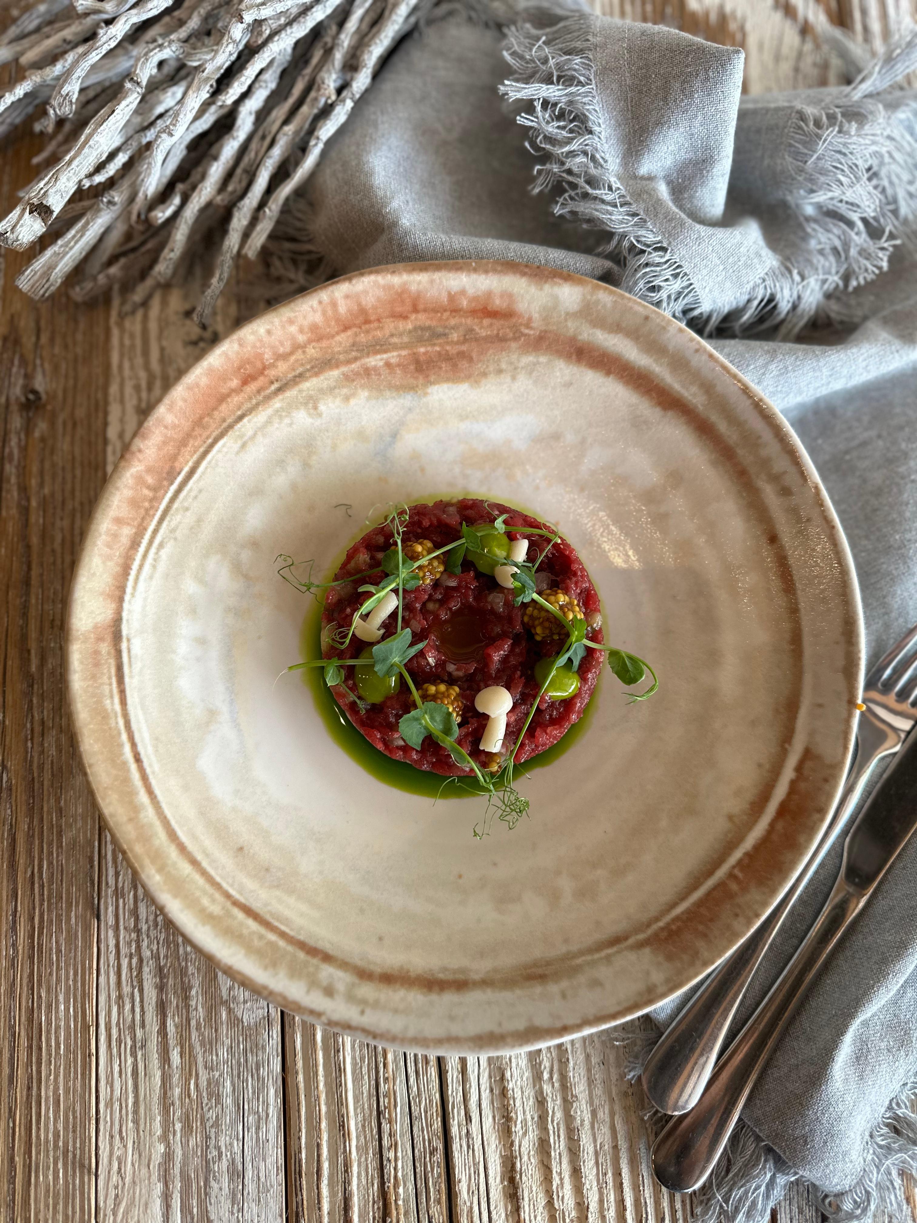 Tatar z bawety wołowej z żółtkiem sous vide, ogórkiem piklowanym, grzybami marynowanymi, szalotką, musztardą gorczycową, majonezem lubczykowym i chrupiącą grzanką z focacci
