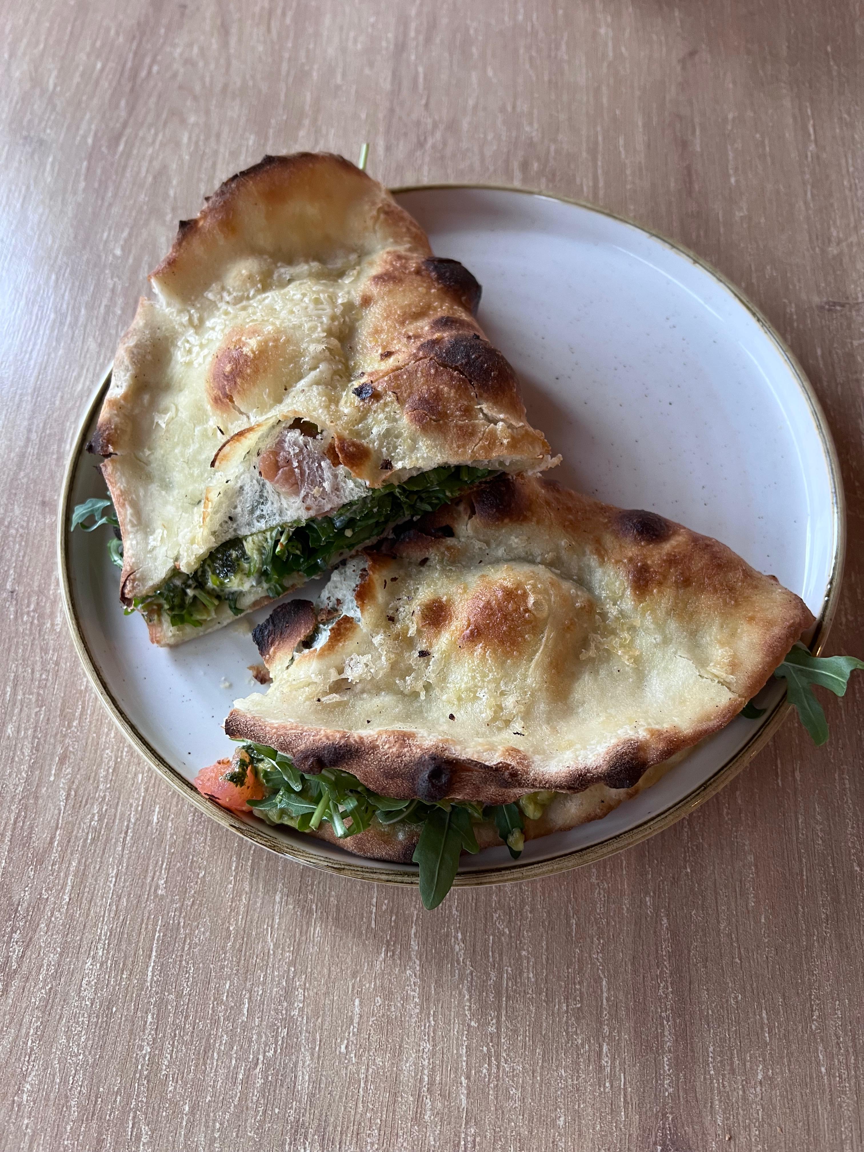 Sos biały / mozzarella fior di latte / świeży szpinak / suszone pomidory / pestki słonecznika