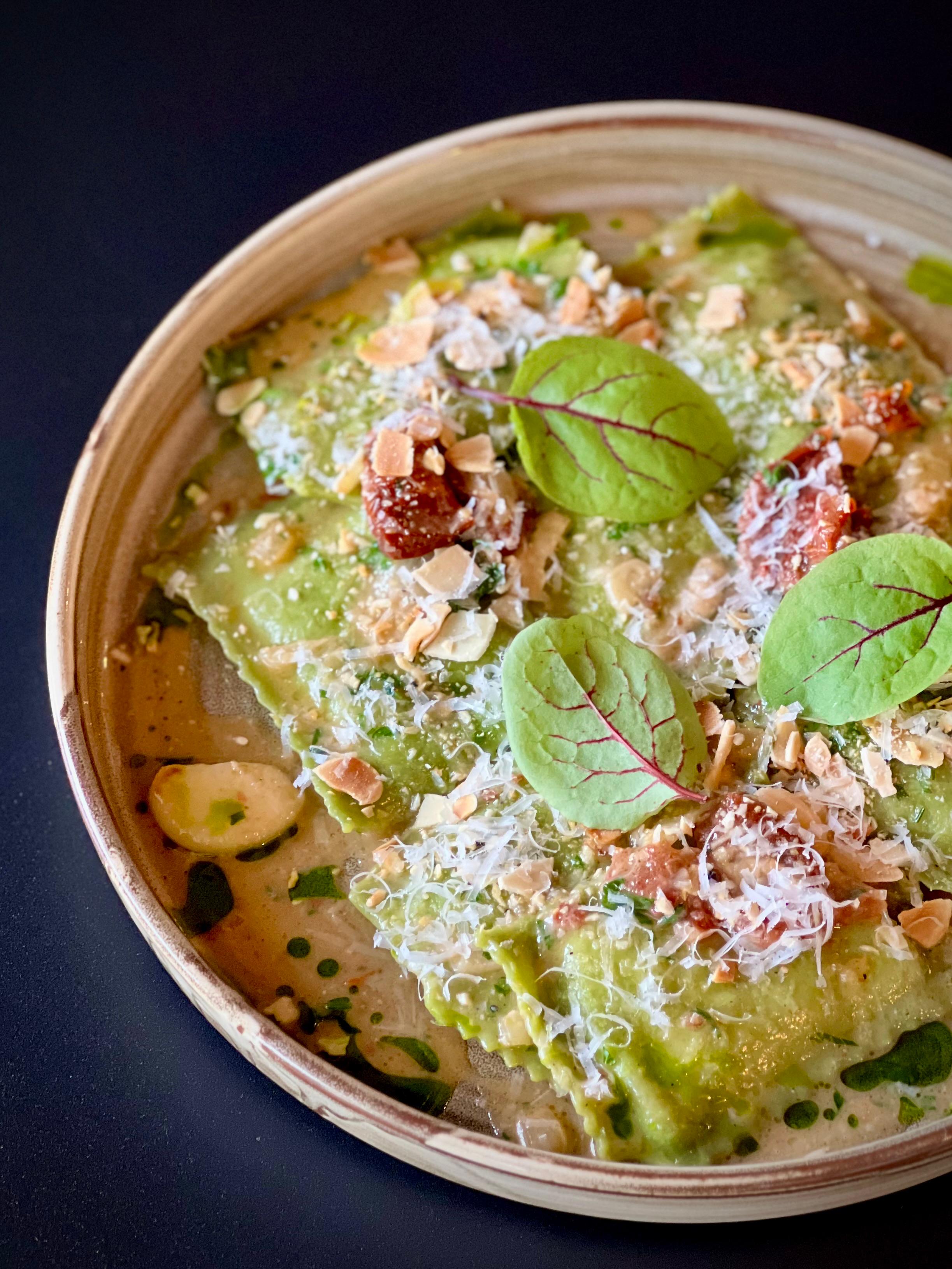 Ravioli szpinakowe z bawolą ricottą w emulsji maślanej z suszonymi pomidorami, prażonymi płatkami migdałów, natką pietruszki i Grana Padano