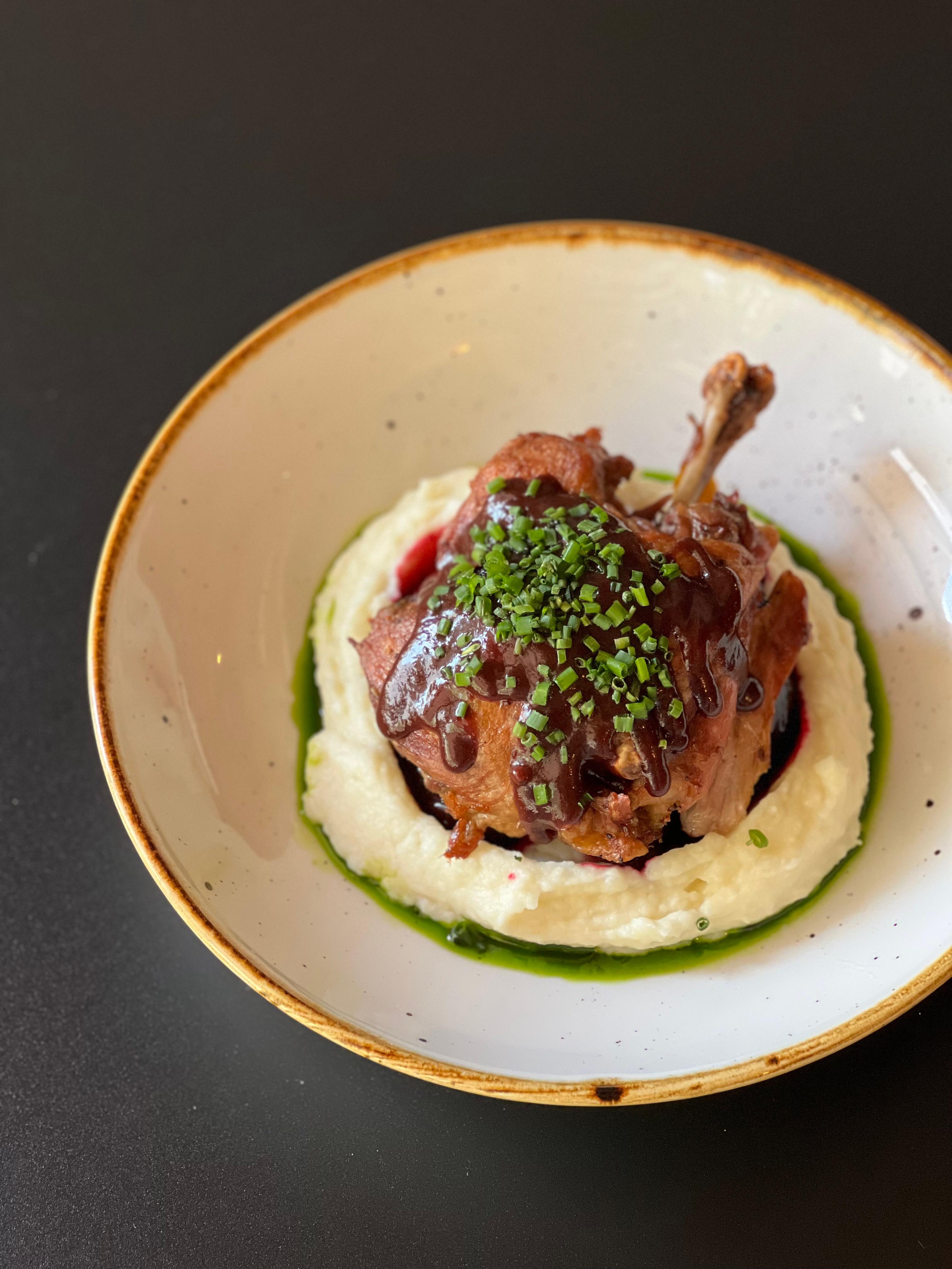 Wolno gotowana noga z kaczki w sosie wiśniowym z puree ziemniaczanym i burakiem glazurowanym z maliną