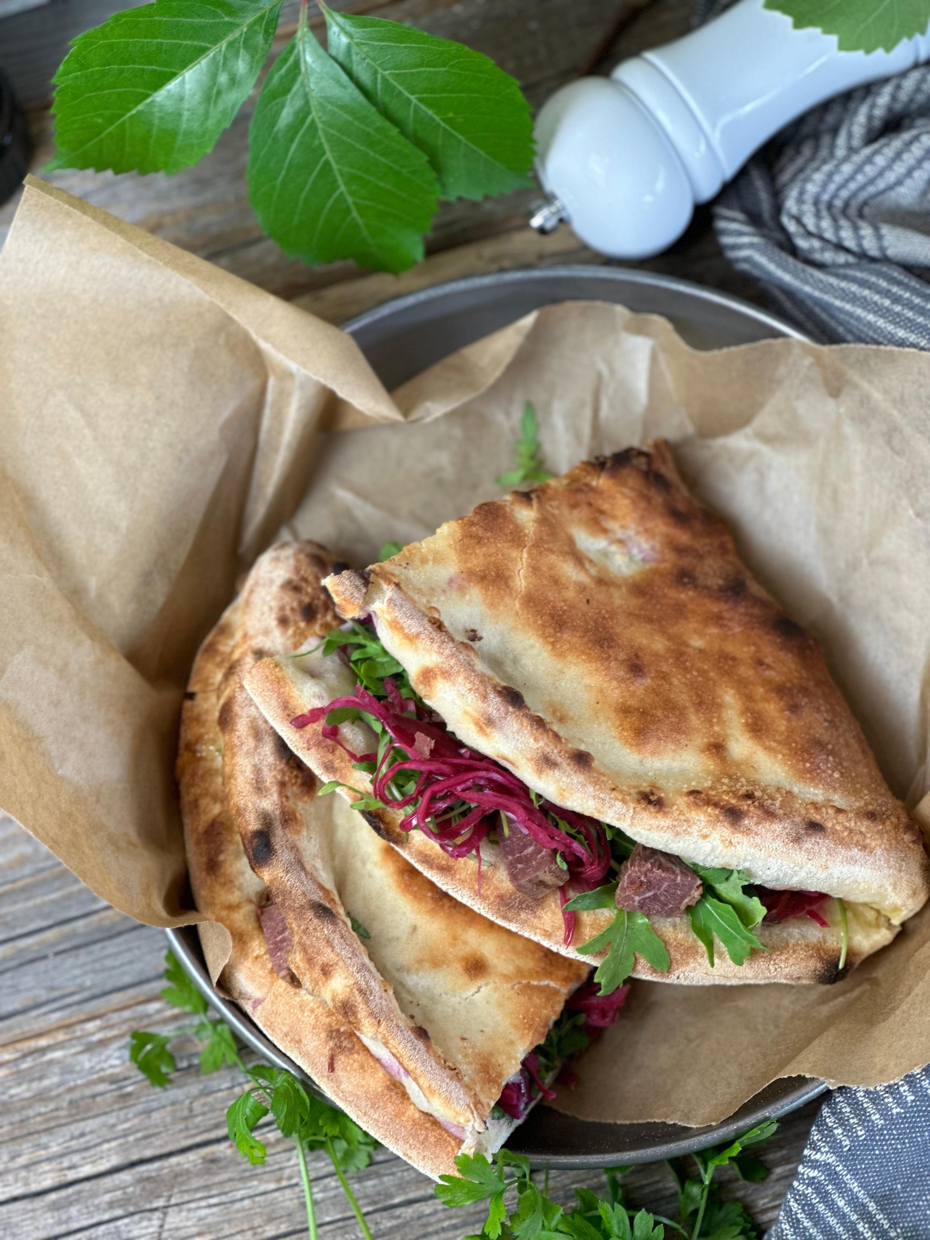Kruche plastry wołowiny z oliwą truflową, rukolą, kaparami, oliwkami kalamata, Grana Padano, paloną cytryną i chrupiącą grzanką z focacci