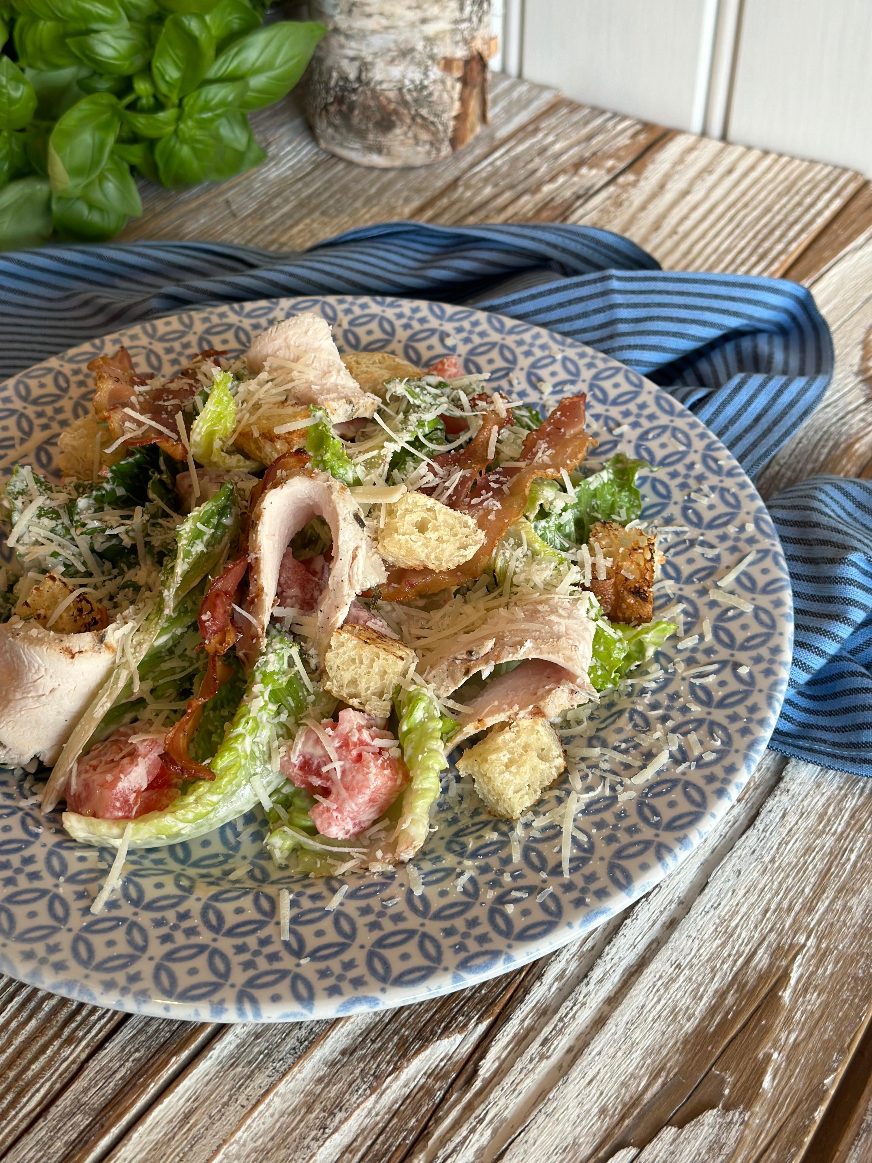 Sałata rzymska z sosem tuńczykowym, grillowaną piersią kurczaka, chipsem z boczku, pomidorami malinowymi, grzankami i Grana Padano