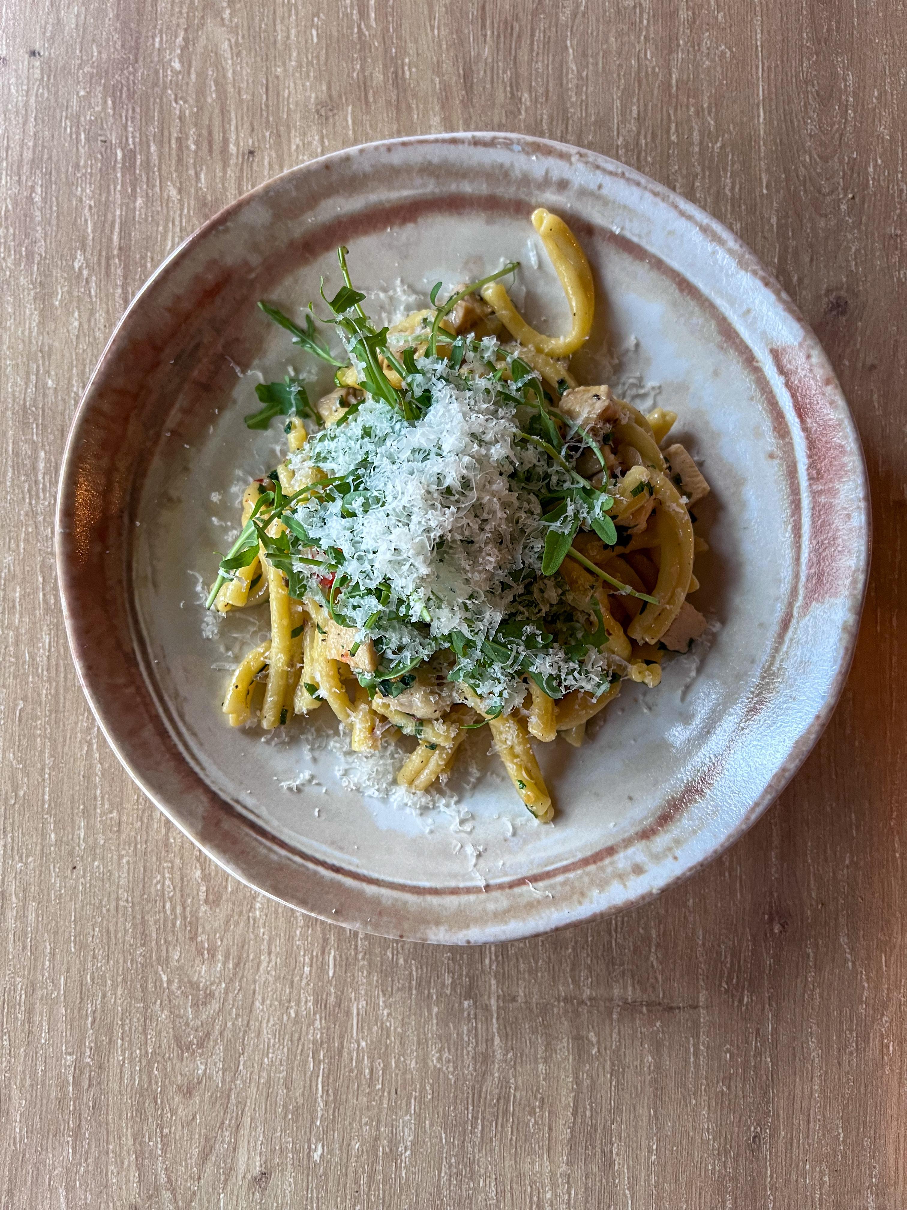 Strozzapreti z grillowanym kurczakiem w emulsji maślanej z czosnkiem, chilli, natką pietruszki, rukolą i Grana Padano