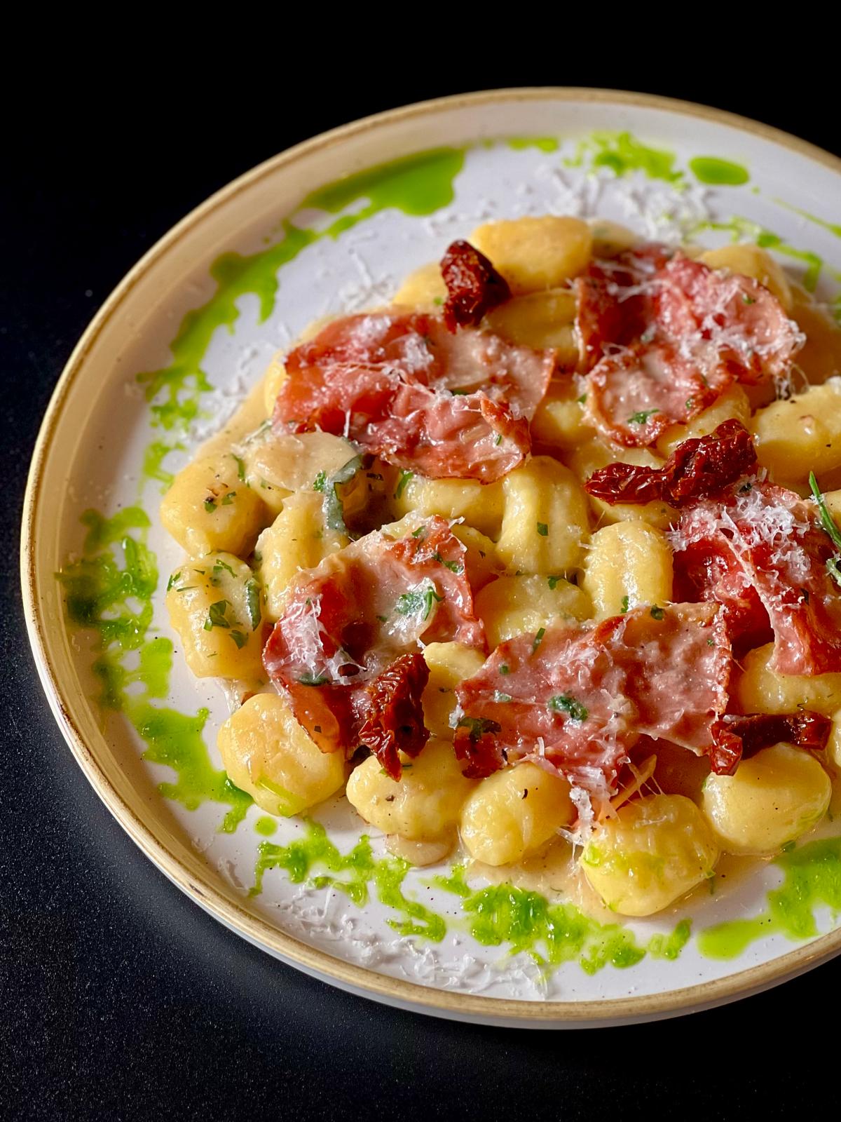Gnocchi w sosie maślano szałwiowym z suszonymi pomidorami, speckiem i Pecorino Romano