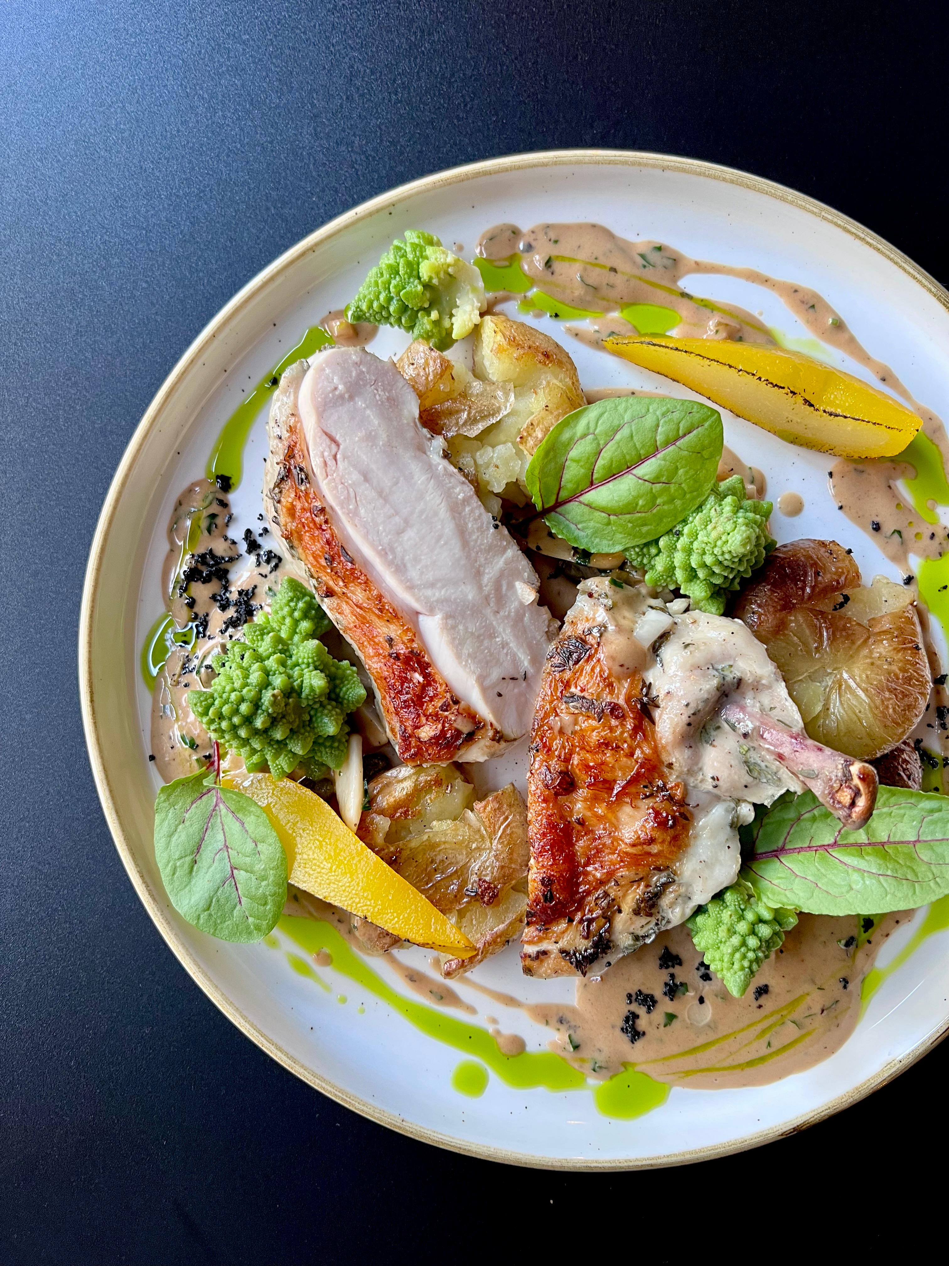 Soczysta pierś z kurczaka z kostką podana z sosem kaparowym, opiekanymi ziemniakami, brokułami romanesco, szafranową gruszką i oliwą estragonową
