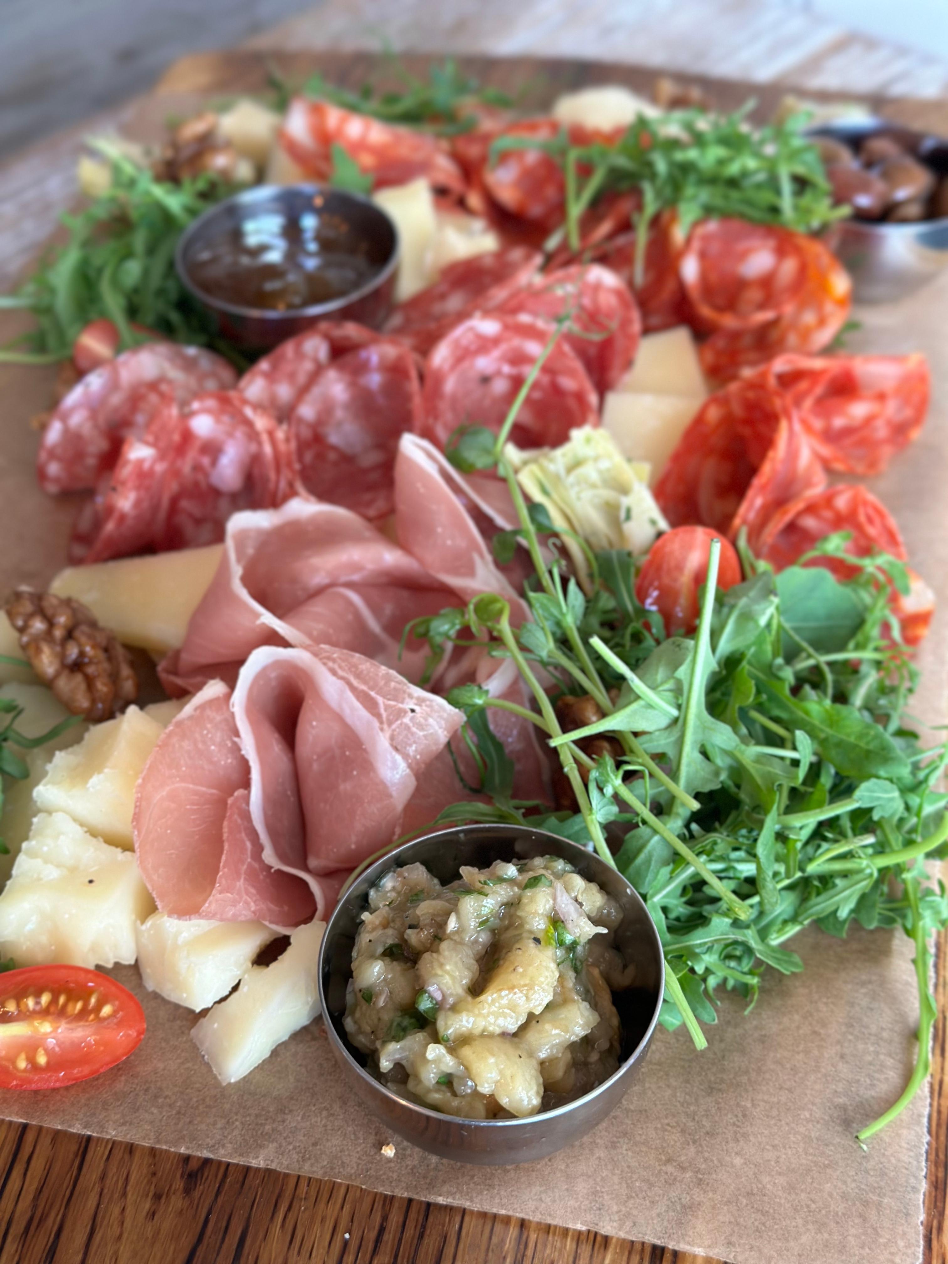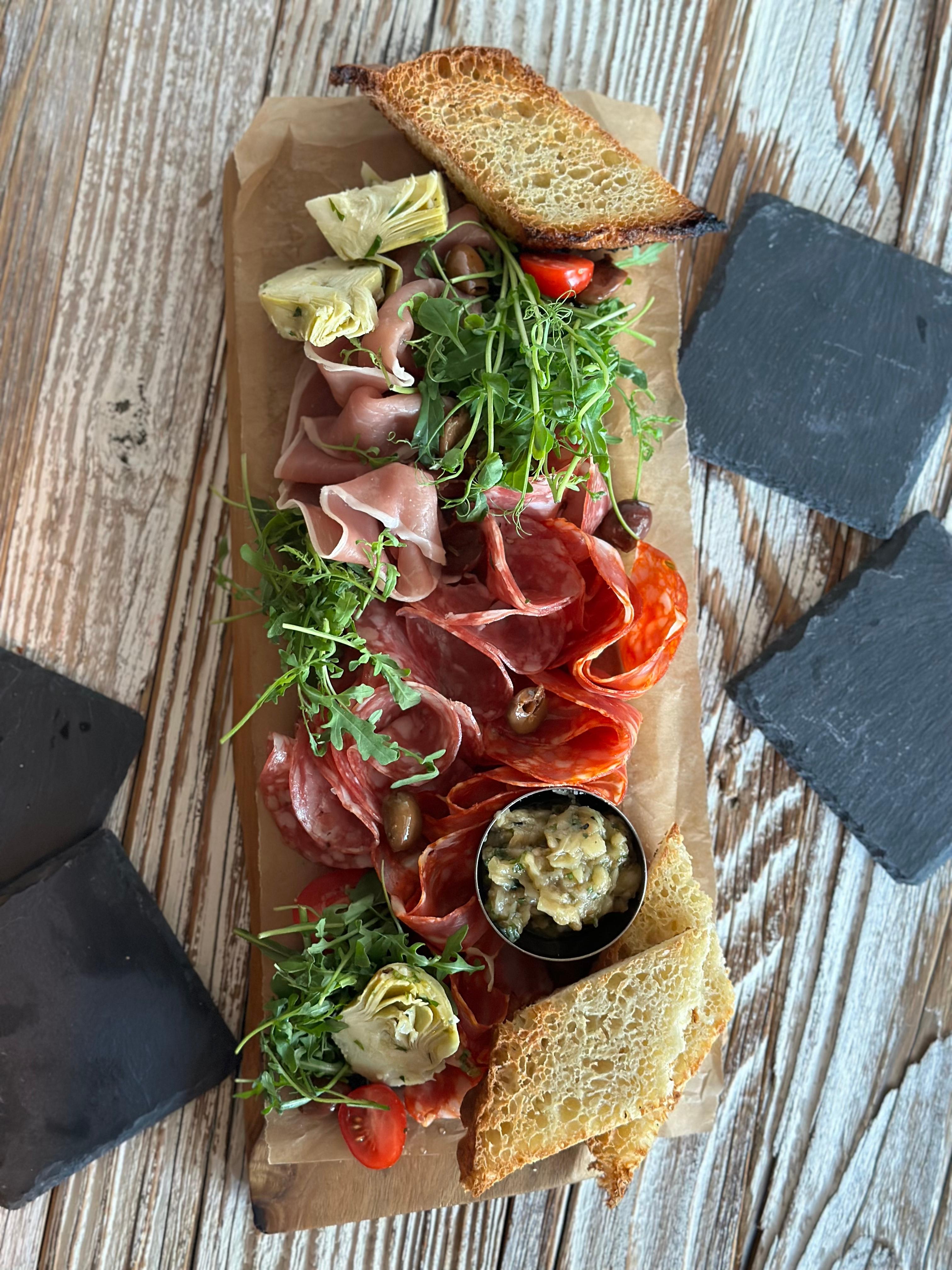 Prosciutto Crudo, Salami Piccante, Salami Napoli, marynowane karczochy, pasta z palonego bakłażana, oliwki kalamata, pomidorki cherry i chrupiące grzanki z focacci