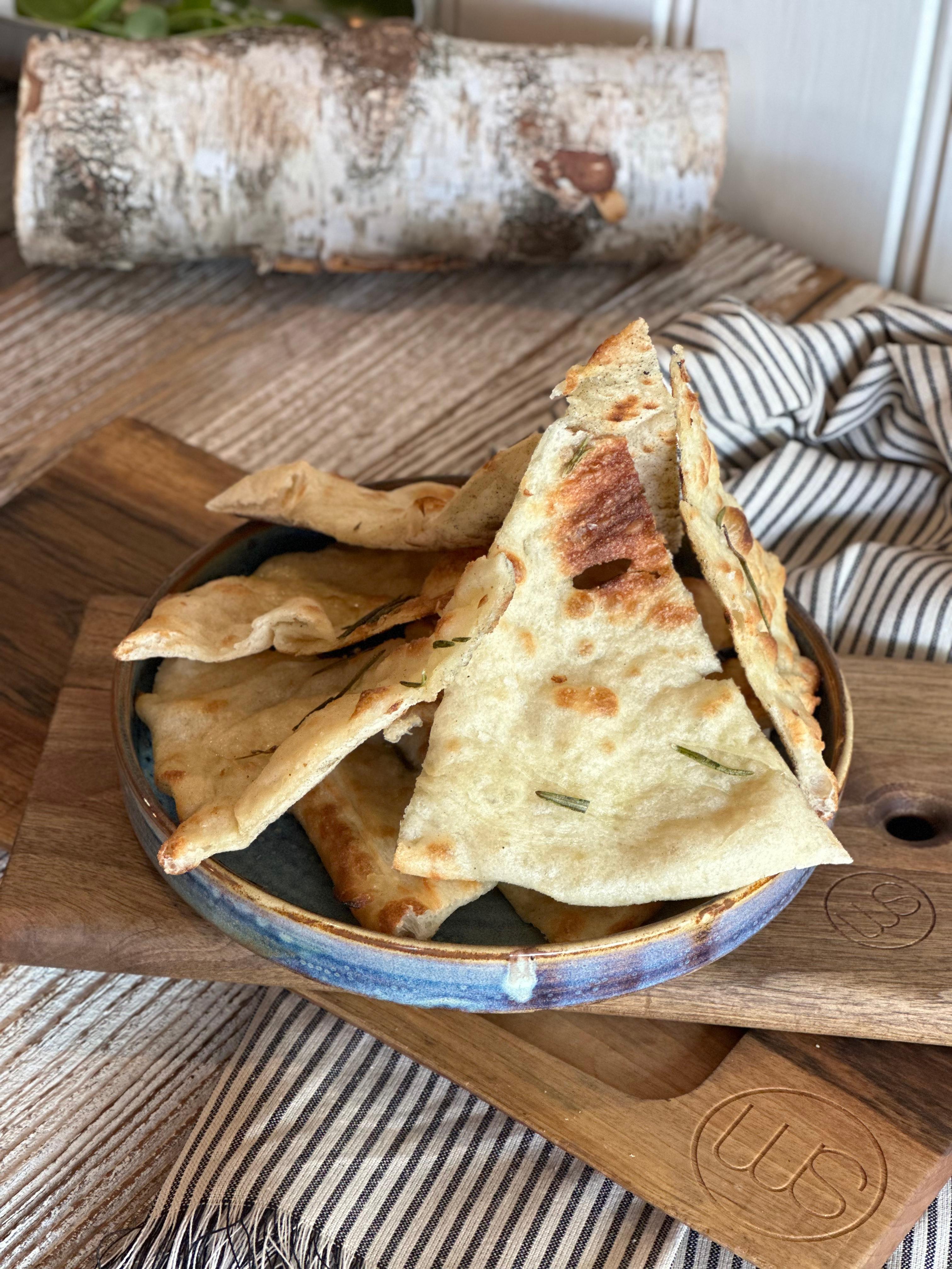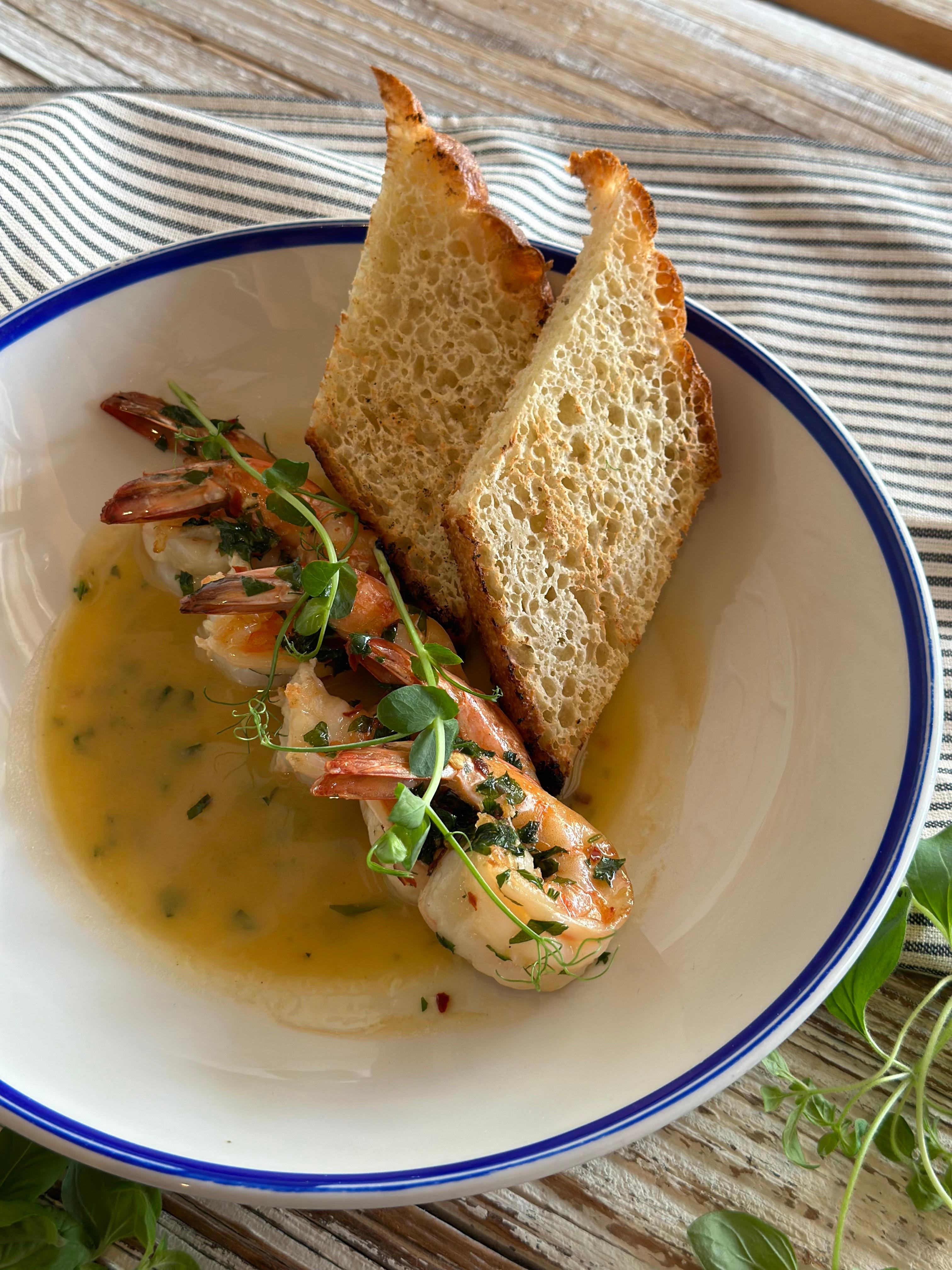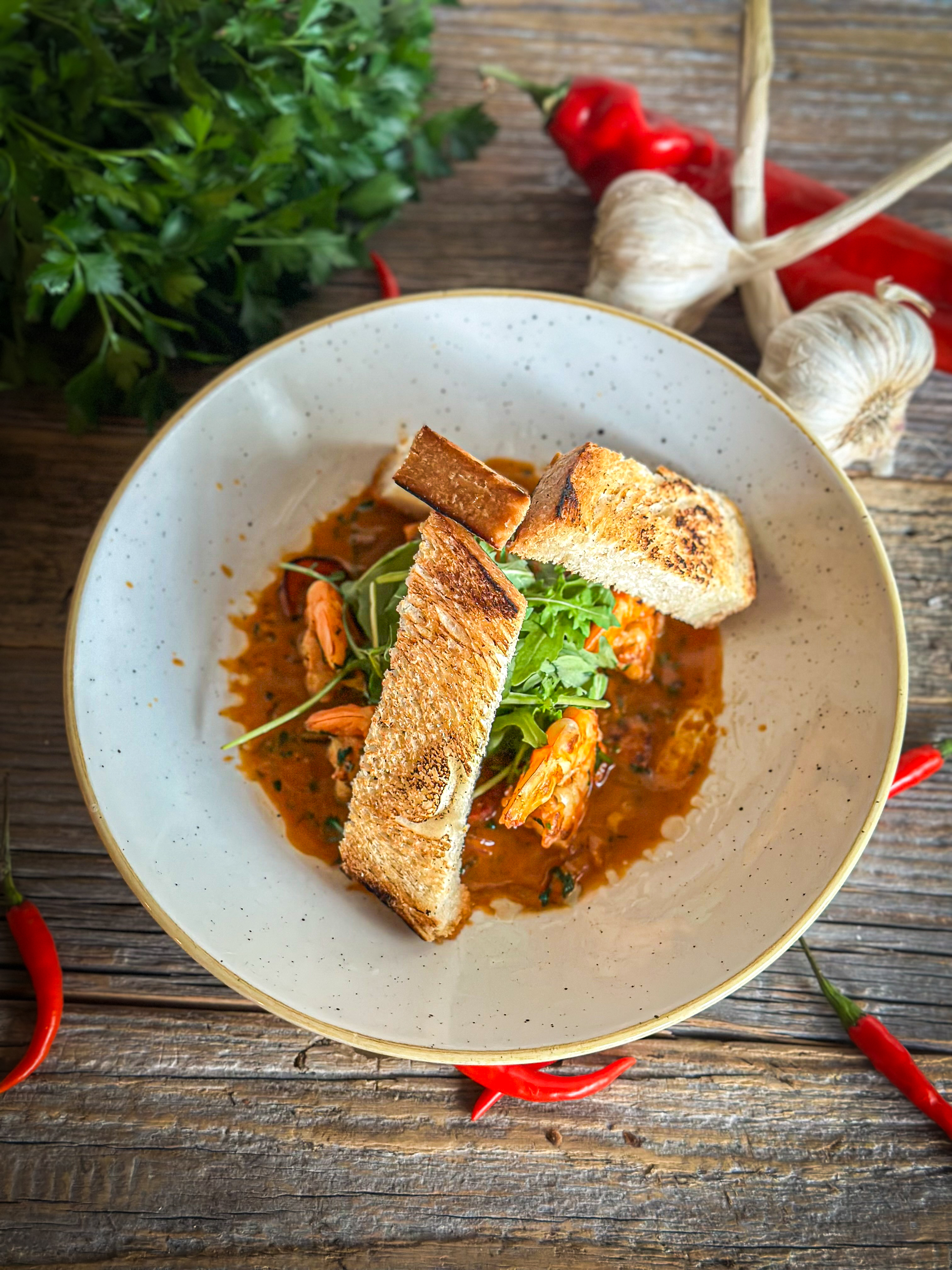 Krewetki w emulsji winno maślanej z czosnkiem, chilli, natką pietruszki i chrupiącą grzanką z focacci