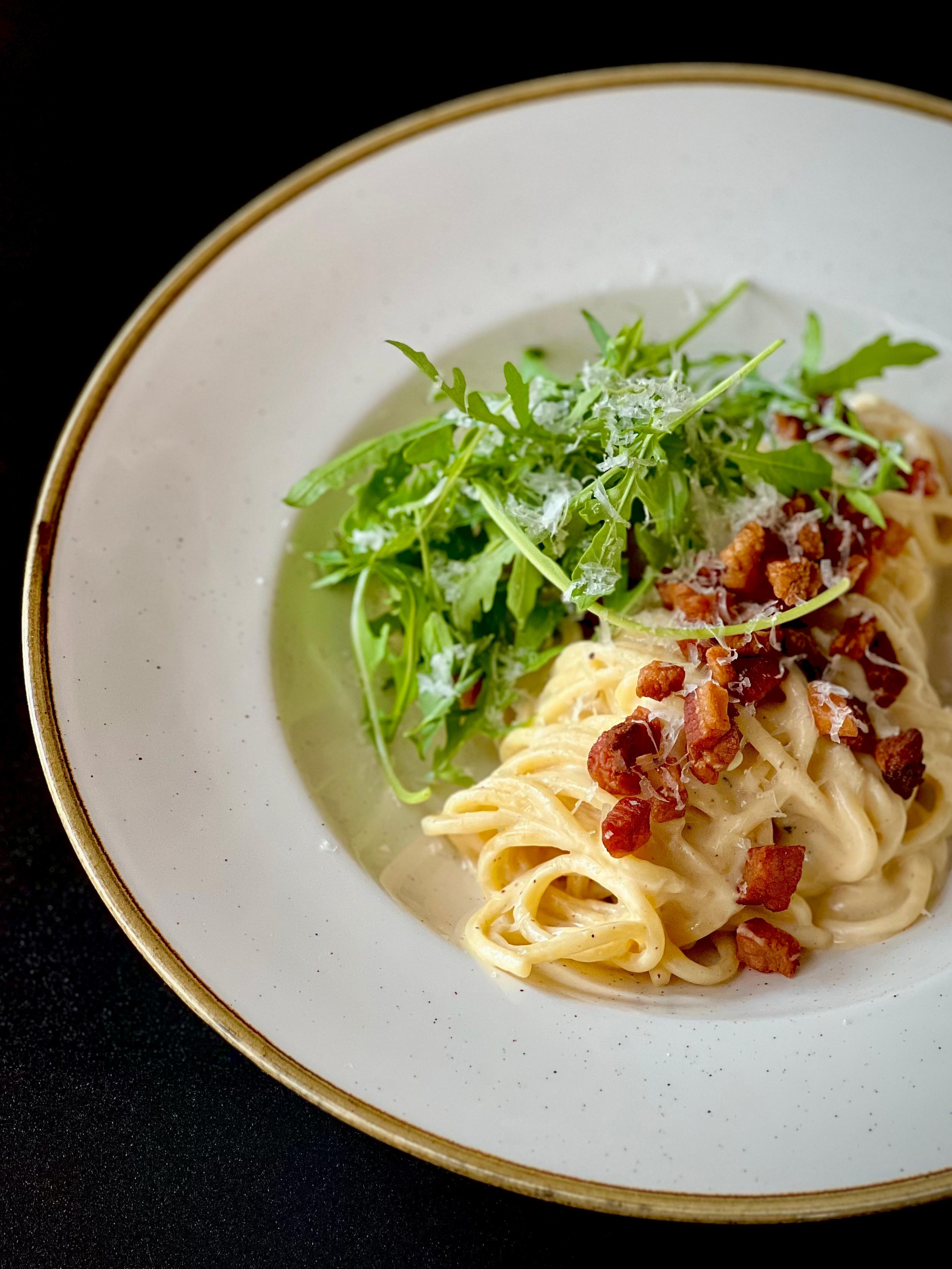 Spaghetti Carbonara z guanciale, kremowym żółtkiem, czarnym pieprzem, Pecorino Romano, Grana Padano i rukolą