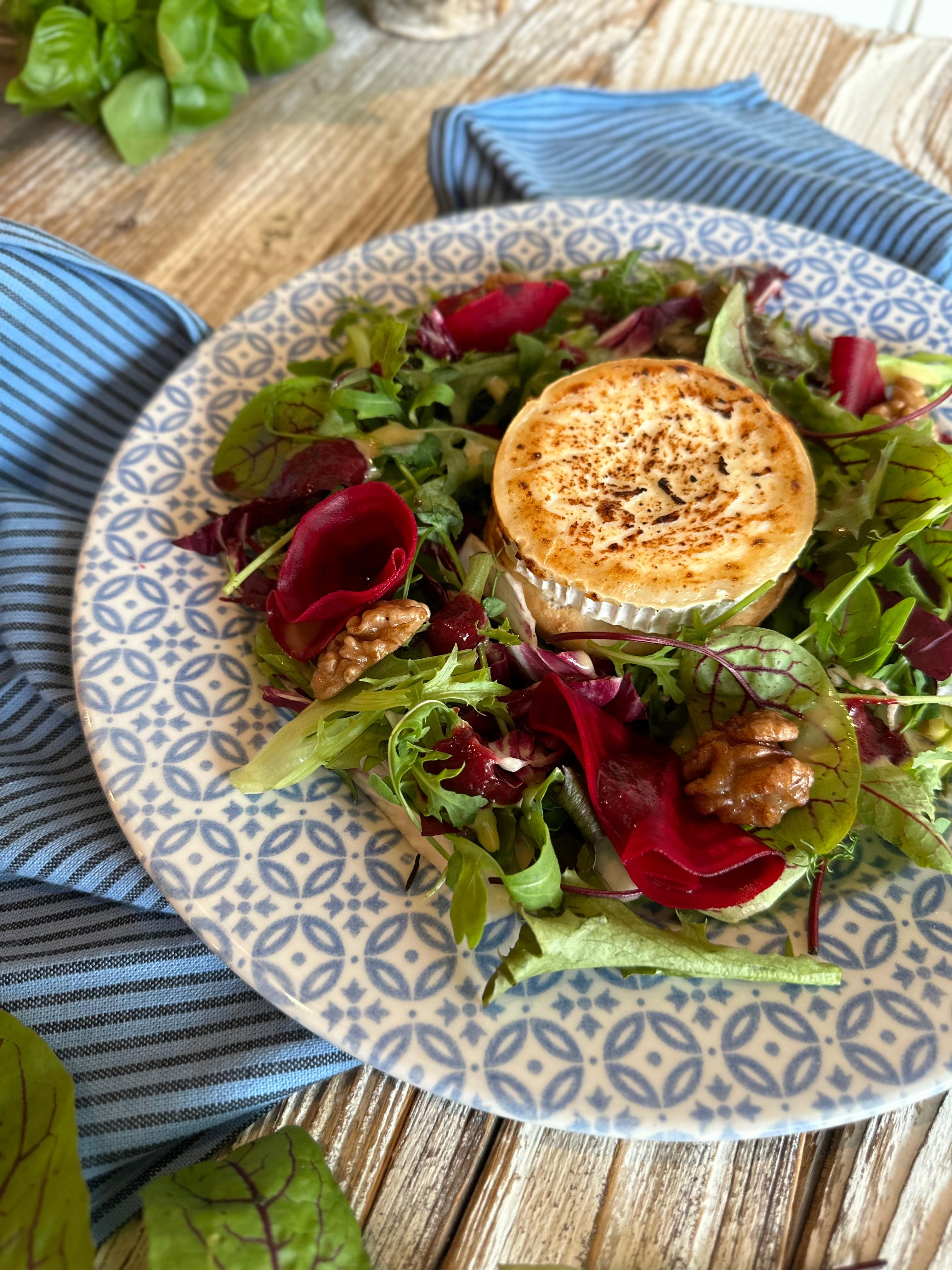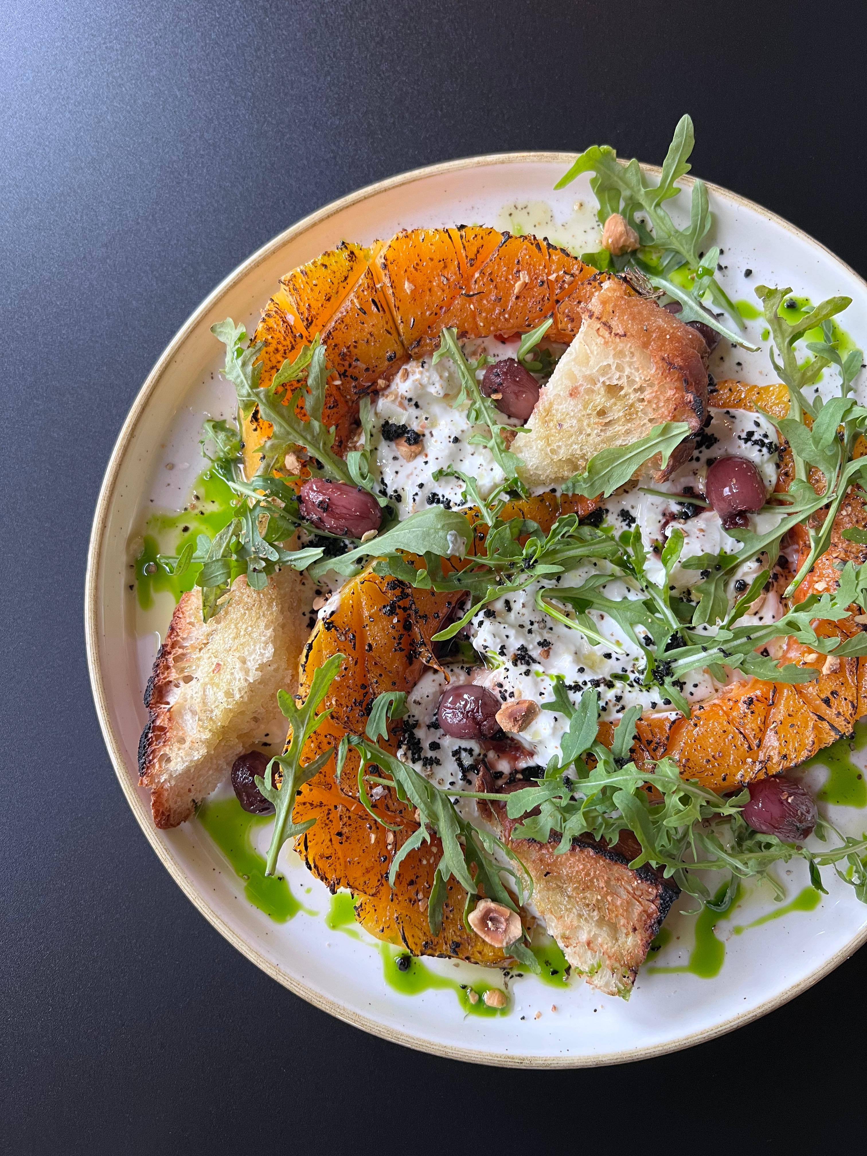 Pieczona dynia z kremową burratą, winogronami w balsamico, rukolą, oliwą szczypiorkową, prażonymi orzechami laskowymi i chrupiącą grzanką z focacci
