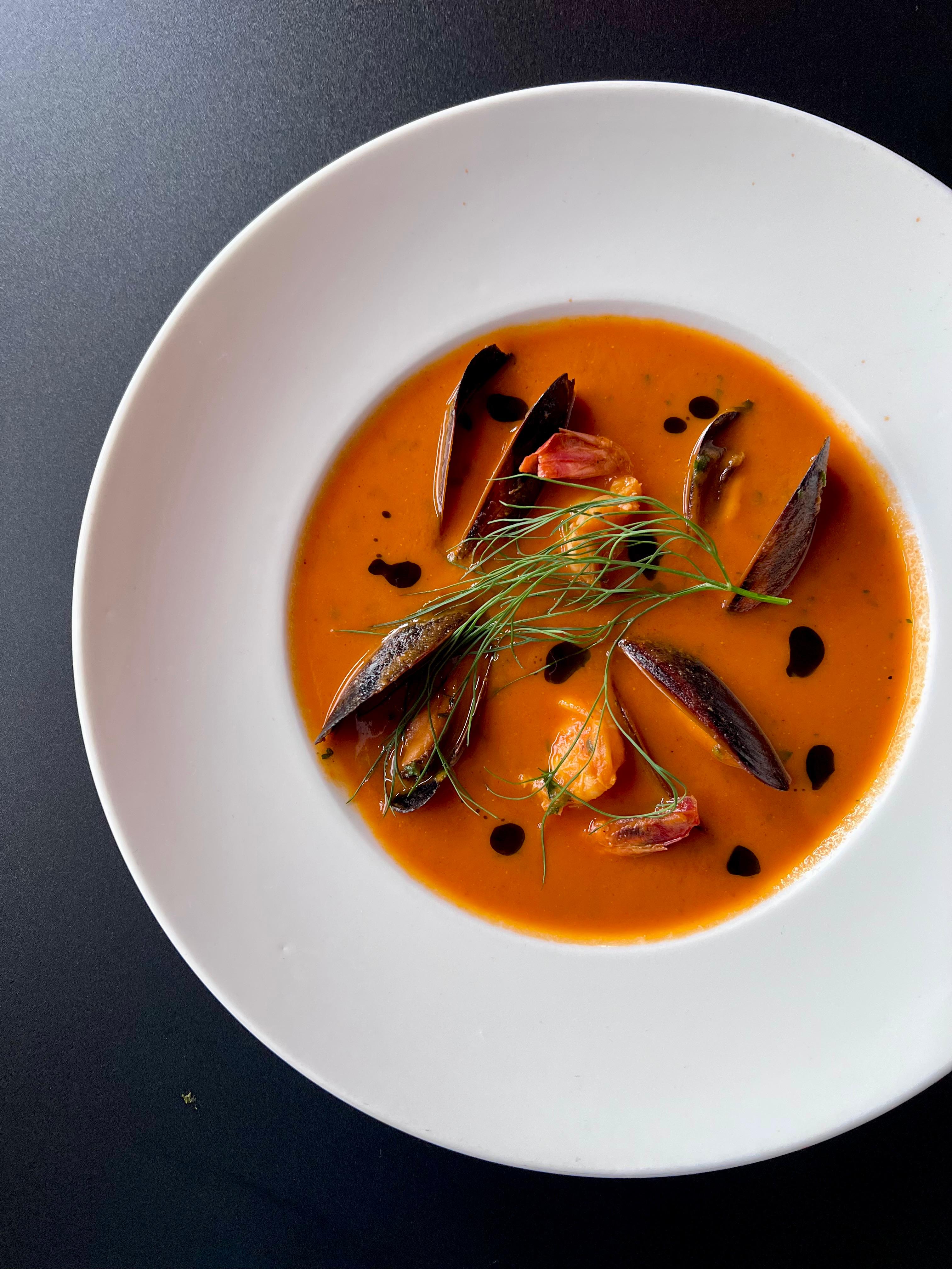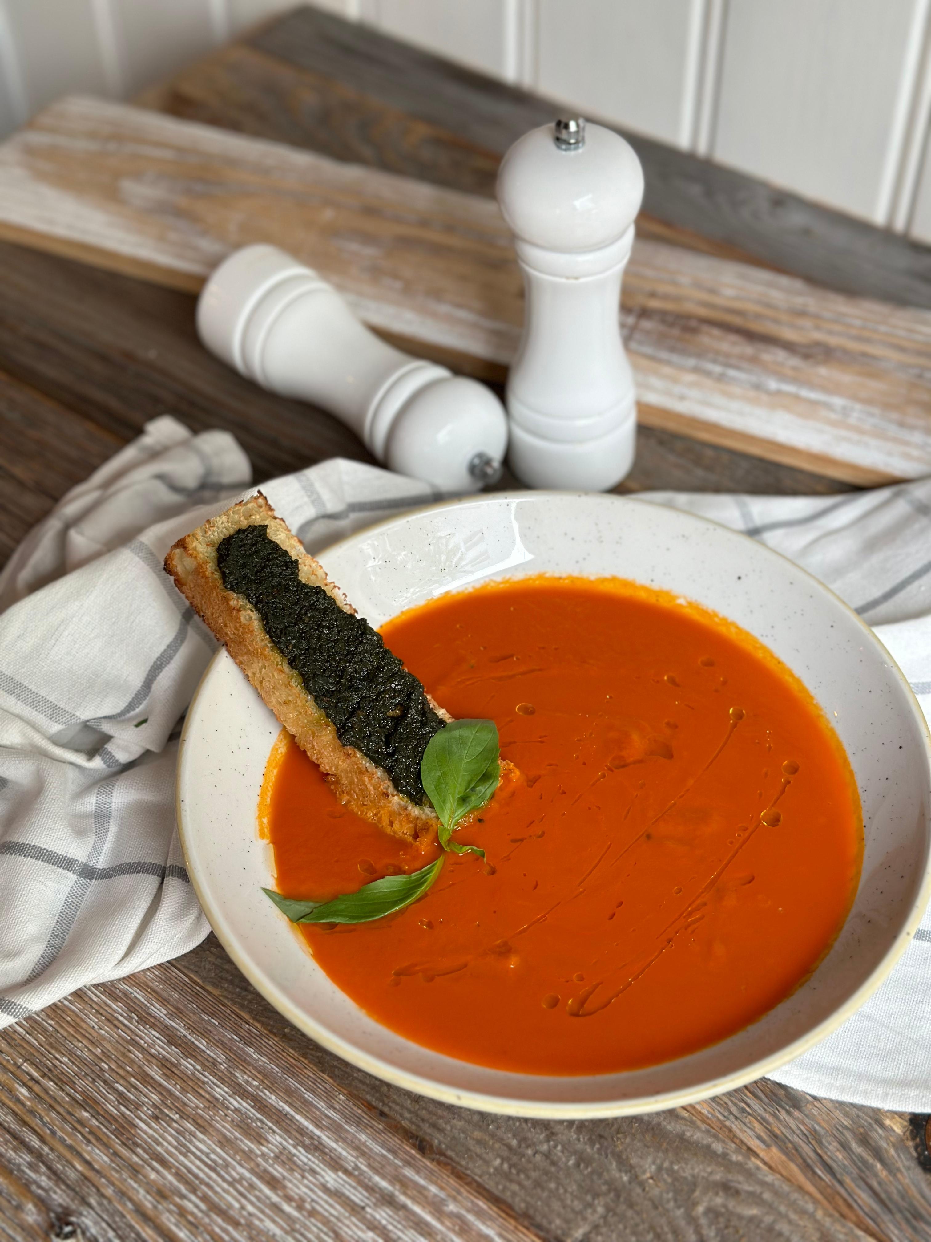 Pikantna zupa na bazie pieczonych pomidorów z krewetkami, mulami i ośmiorniczkami podana z grzanką z bazyliowym pesto
