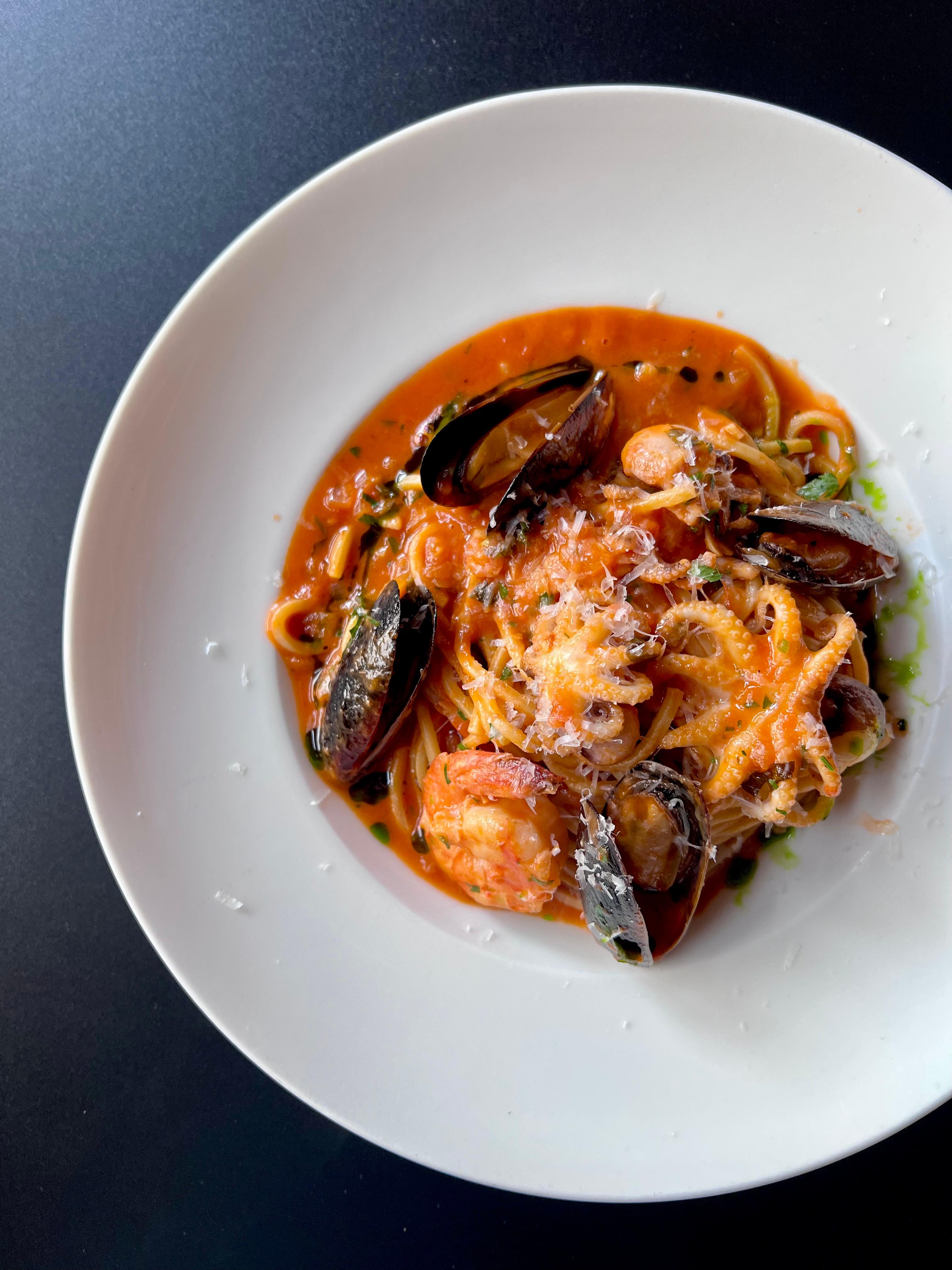 Spaghetti z krewetkami, mulami, ośmiorniczkami, czosnkiem, natką pietruszki i szafranem w pikantnym sosie pomidorowym z Grana Padano