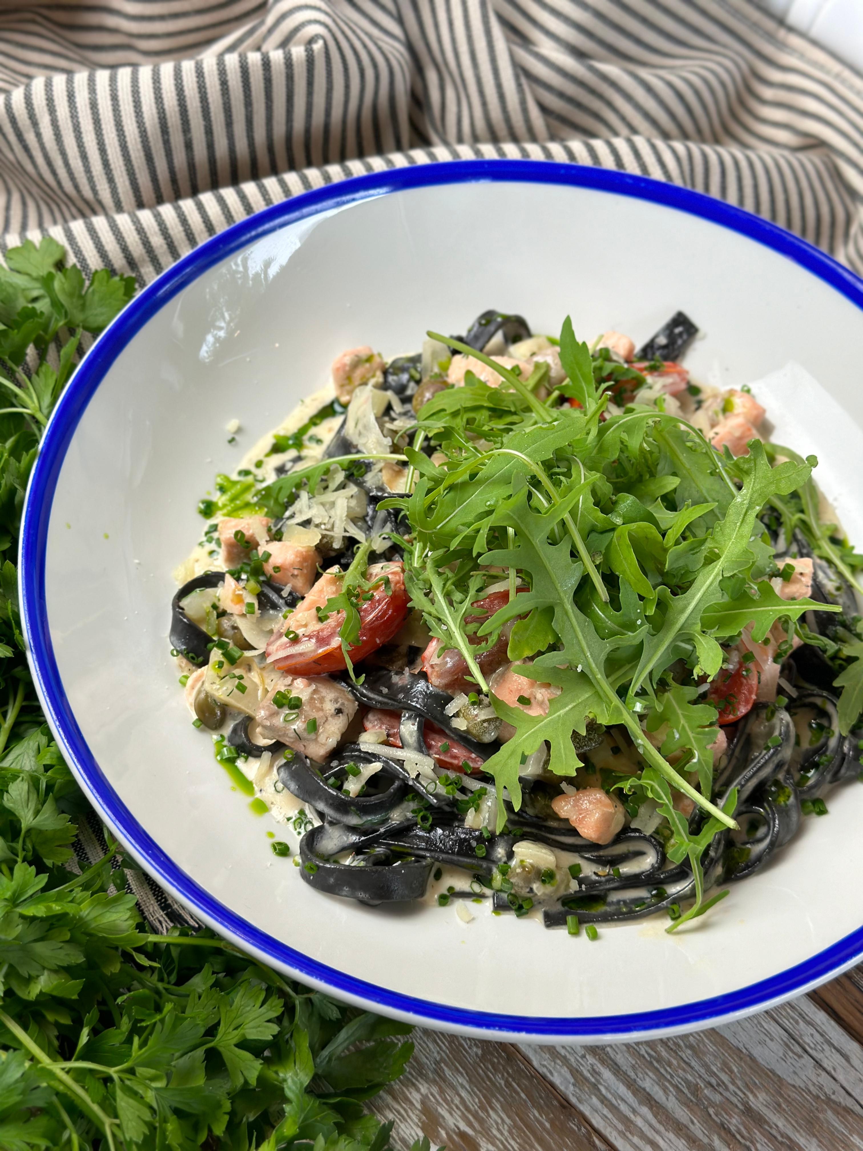 Tagliatelle barwione sepią z łososiem, śmietaną, czosnkiem, kaparami, pomidorkami cherry, świeżym koperkiem i Grana Padano