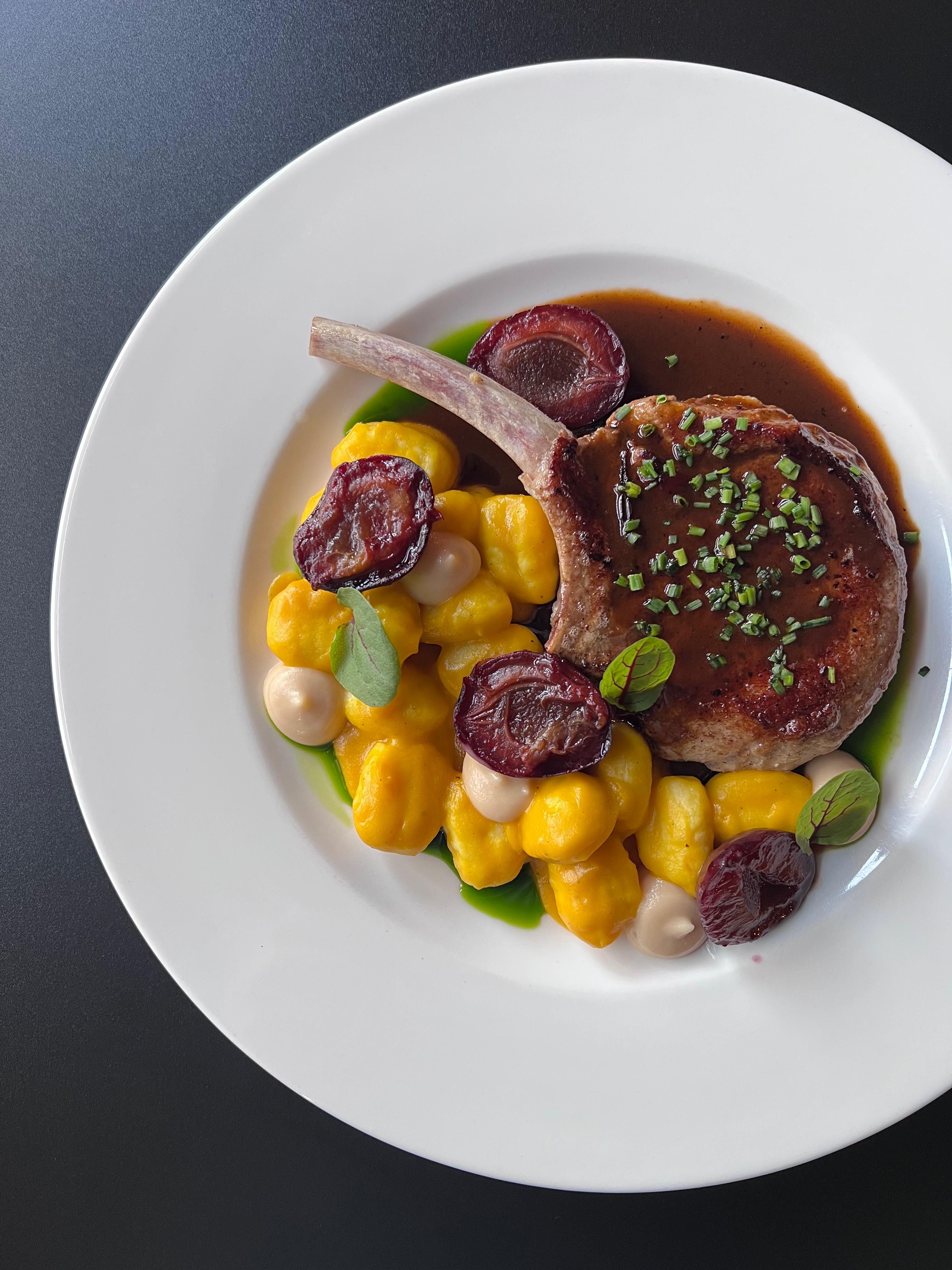 Schab z kością w sosie demi glace z dyniowymi gnocchi, śliwkami w balsamico, musem z zielonego jabłka i szczypiorkiem