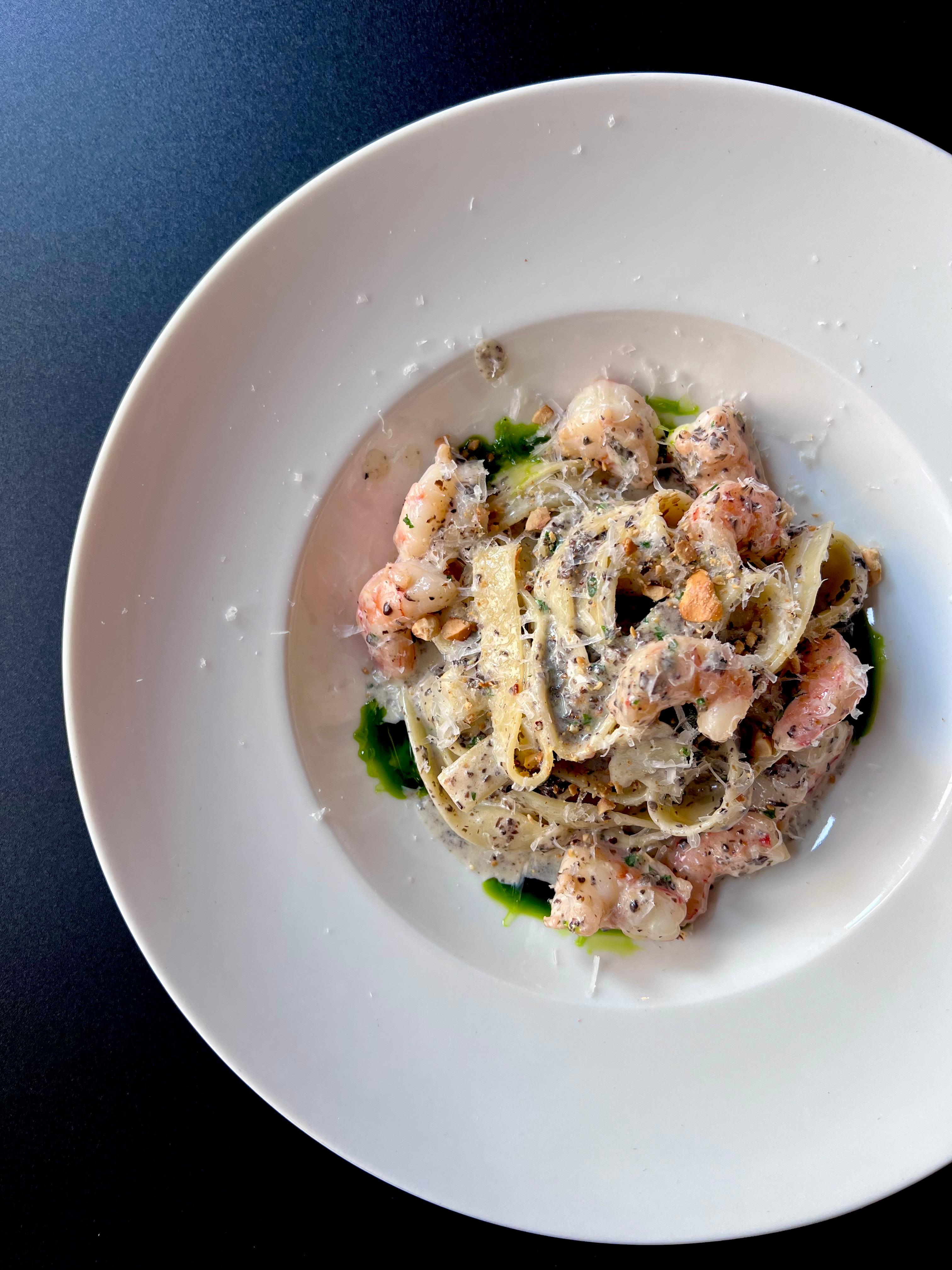 Fettuccine z krewetkami w kremowym sosie z pastą truflową i brandy, prażonymi orzechami laskowymi, natką pietruszki i Grana Padano