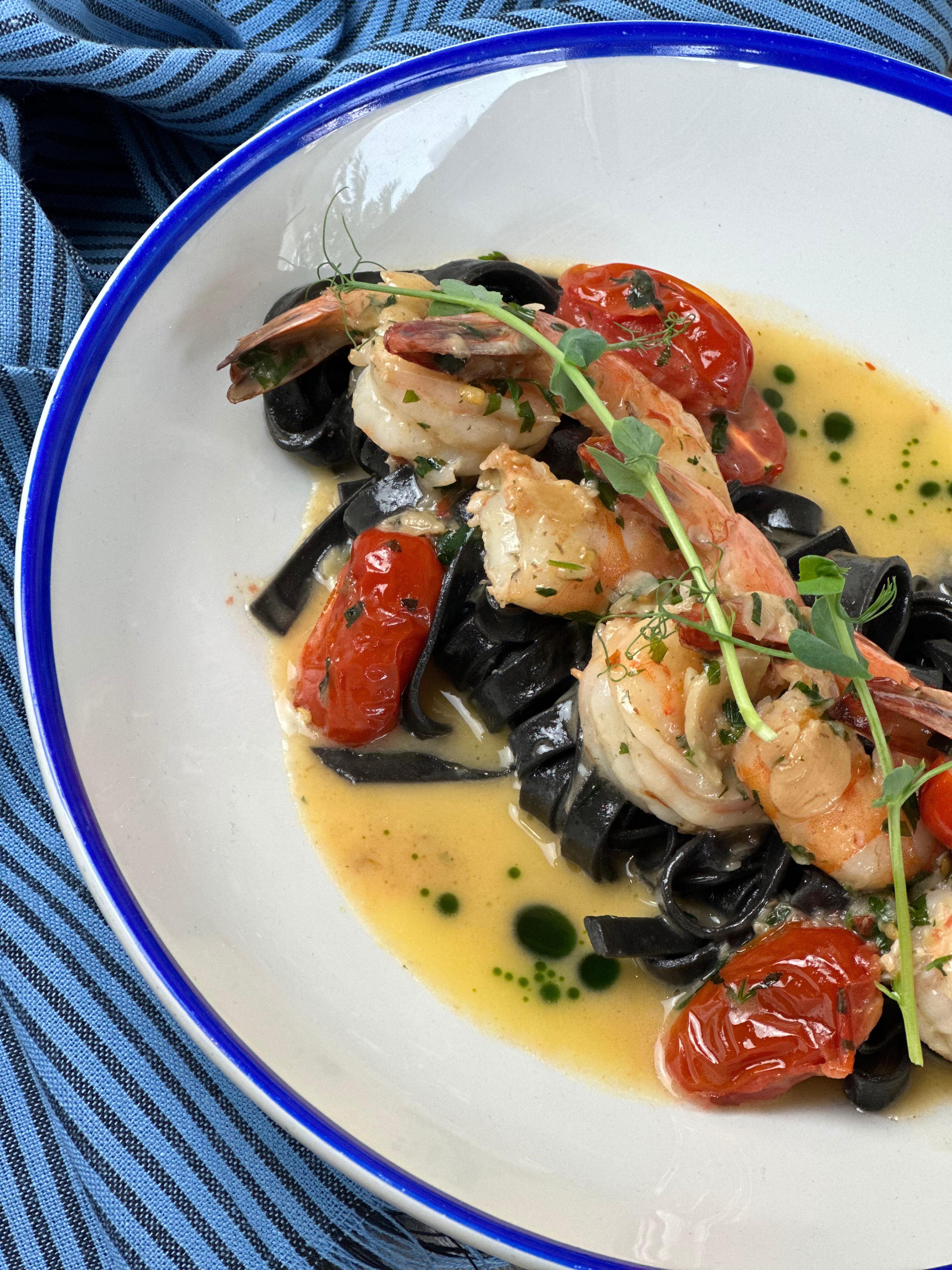 Tagliatelle barwione sepią z krewetkami w emulsji winno maślanej z czosnkiem, pomidorkami cherry, chilli i natką pietruszki