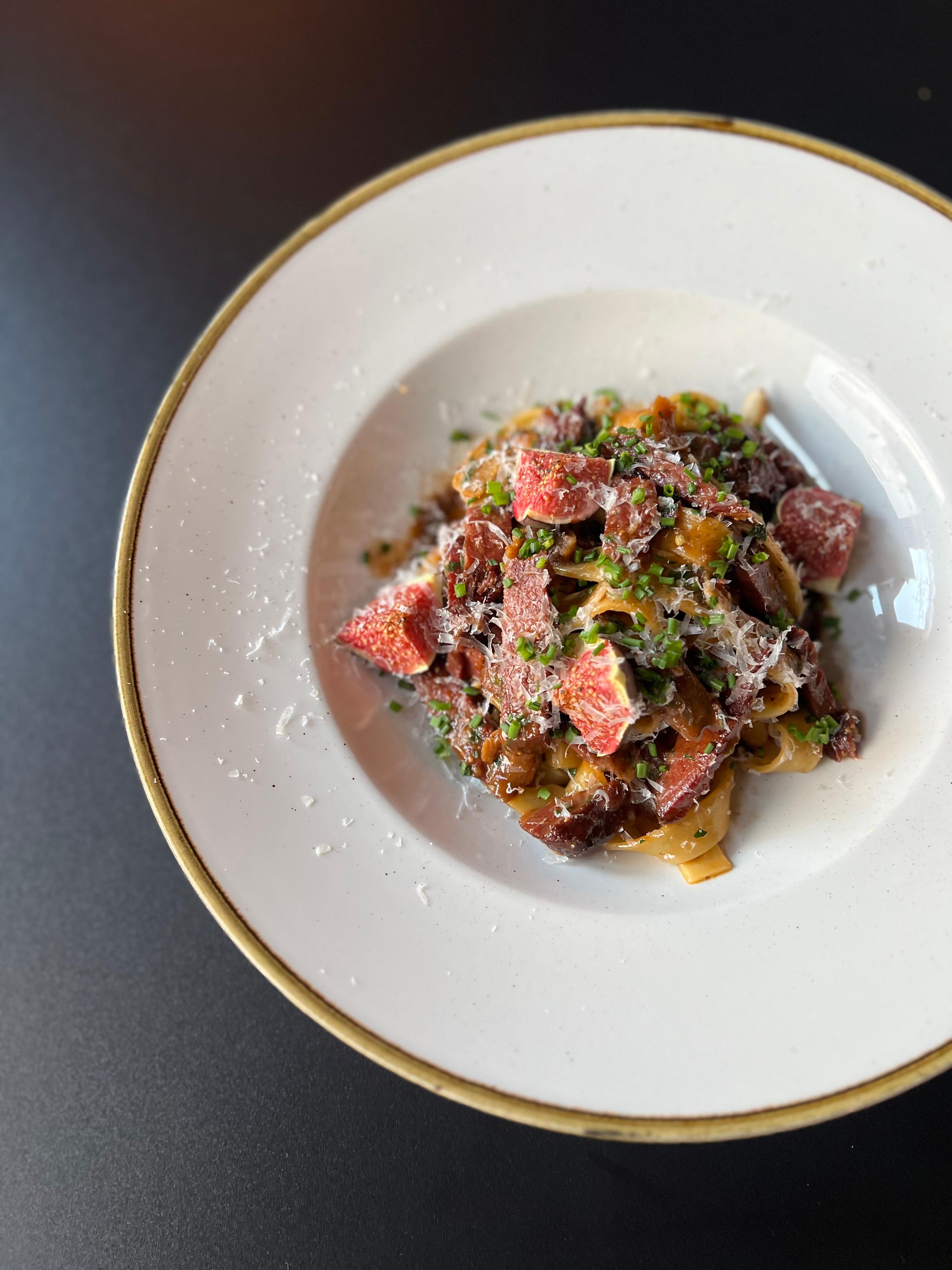 Fettuccine z mostkiem wołowym w sosie demi glace z figami, czosnkiem, natką pietruszki, szczypiorkiem i Grana Padano