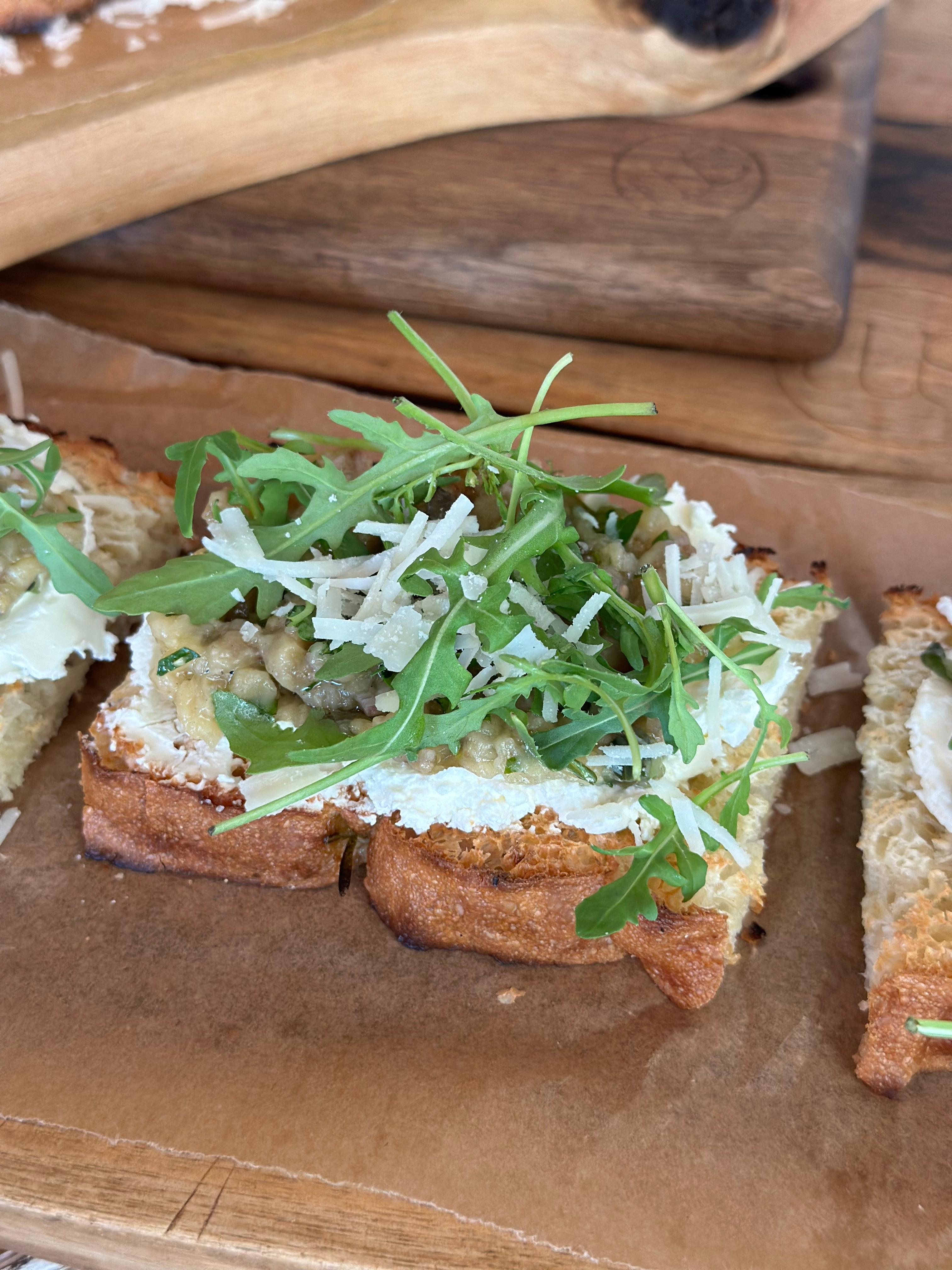 Bruschetta z pastą z palonego bakłażana, kremowym serkiem, oliwą czosnkową, rukolą i Grana Padano