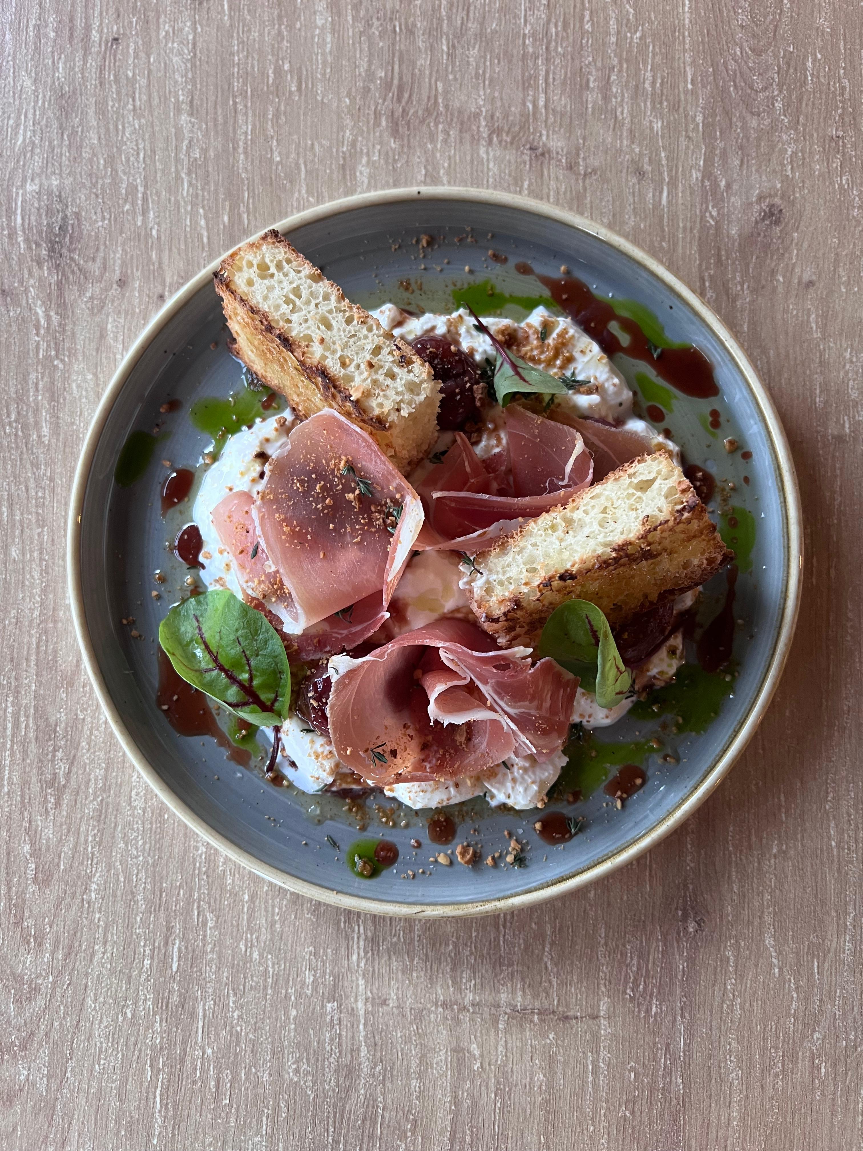 Burrata z pieczonymi winogronami w balsamico, miodzie i tymianku z Prosciutto Crudo, prażonymi orzechami laskowymi i pudrem z czarnych oliwek podana z chrupiącą grzanką z focacci