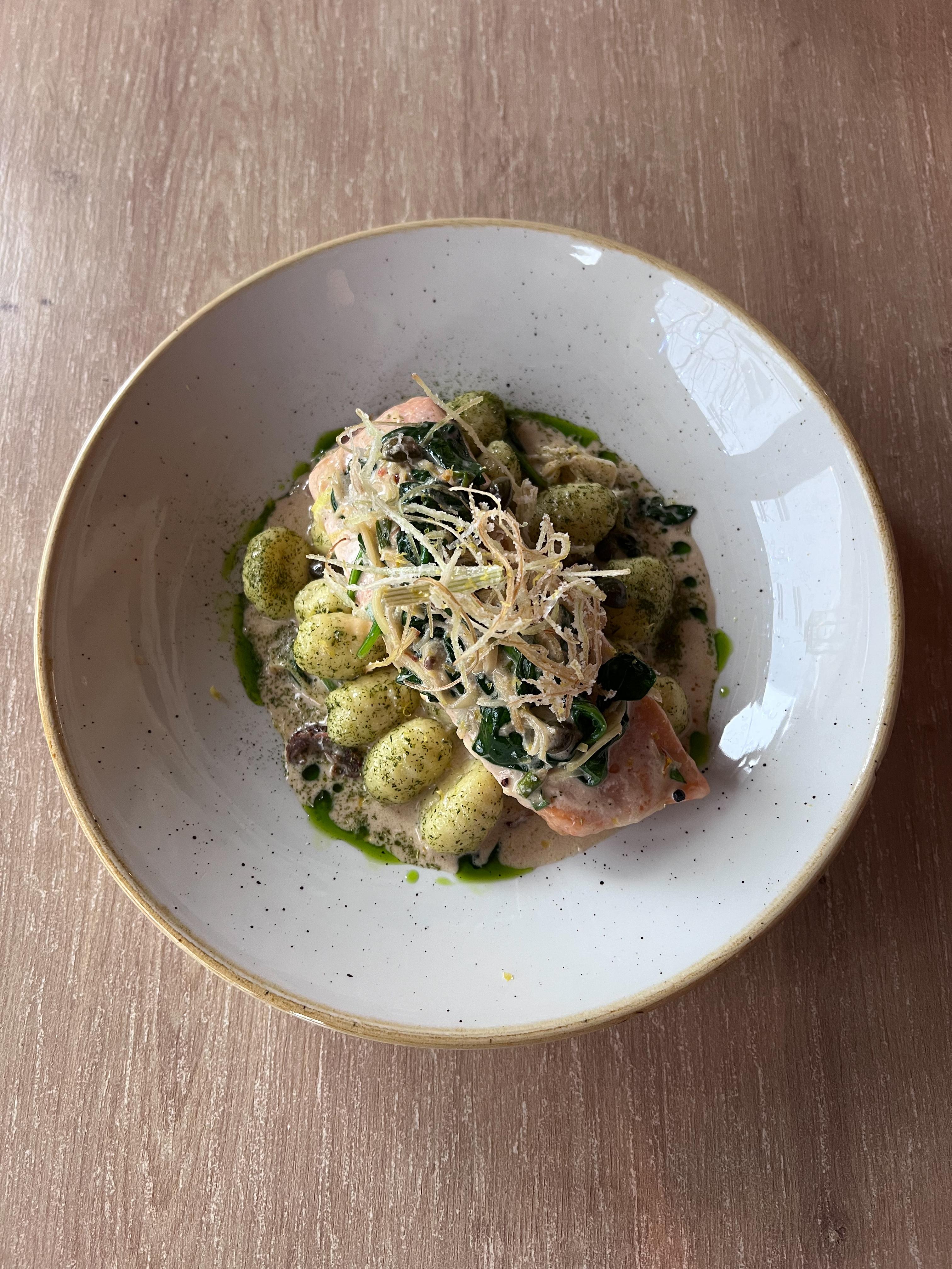 Filet z łososia duszony w śmietanie z białym winem, szpinakiem, suszonymi pomidorami i kaparami podany z ziemniaczanymi gnocchi, chrustem z pora i koperkowym pudrem