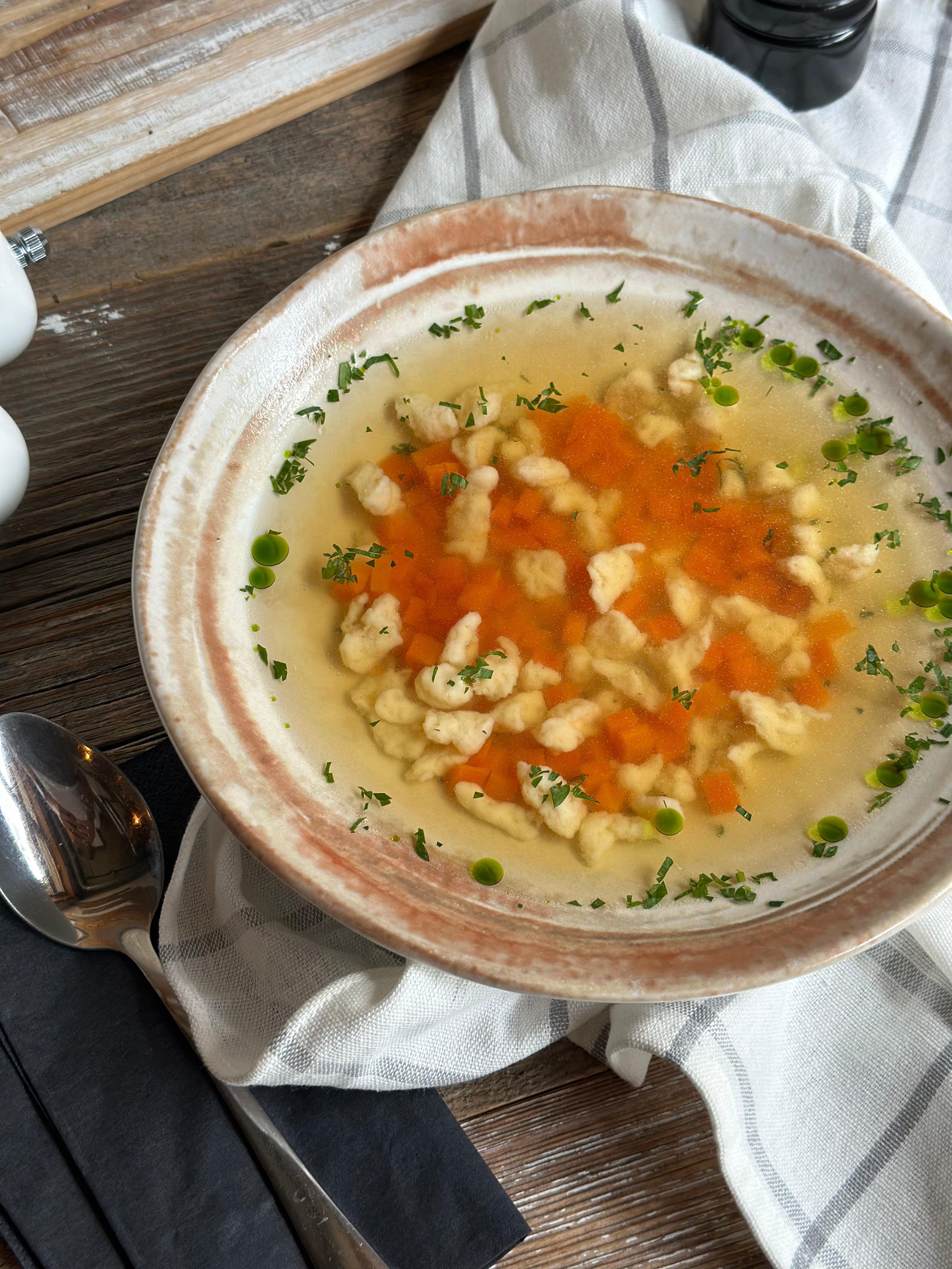 Rosół drobiowo wołowy z gotowaną marchewką, kluseczkami parmezanowymi i natką pietruszki