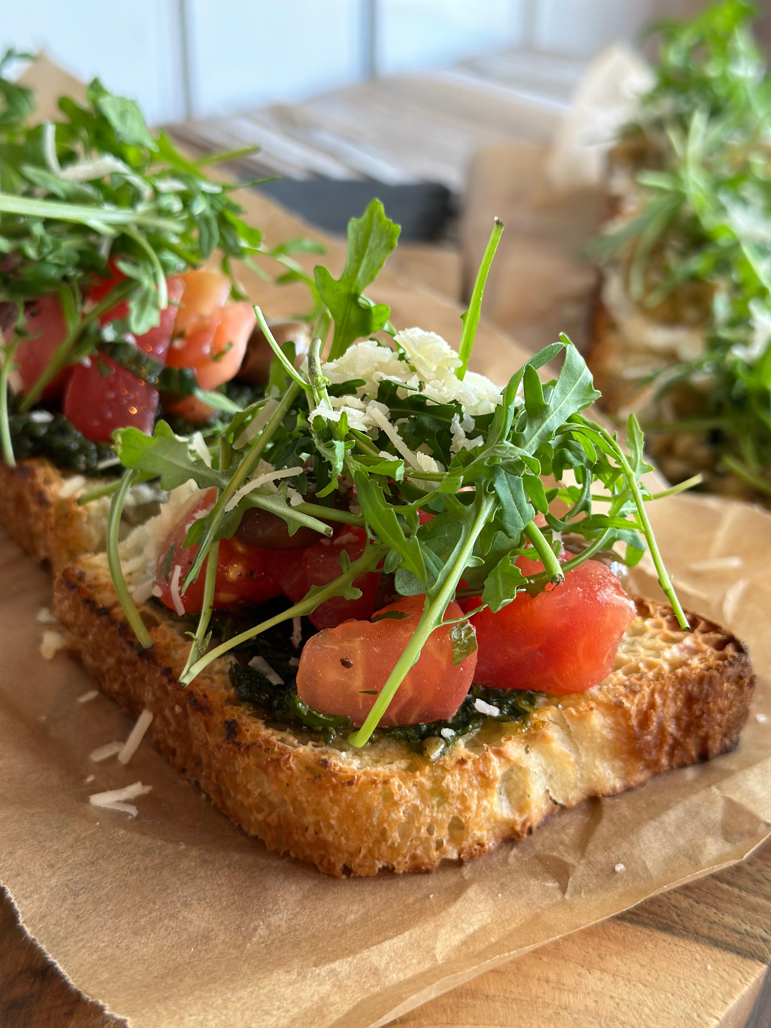 Bruschetta z bazyliowym pesto, pomidorami macerowanymi w oliwie czosnkowej z solą morską, oliwkami kalamata, rukolą i Grana Padano