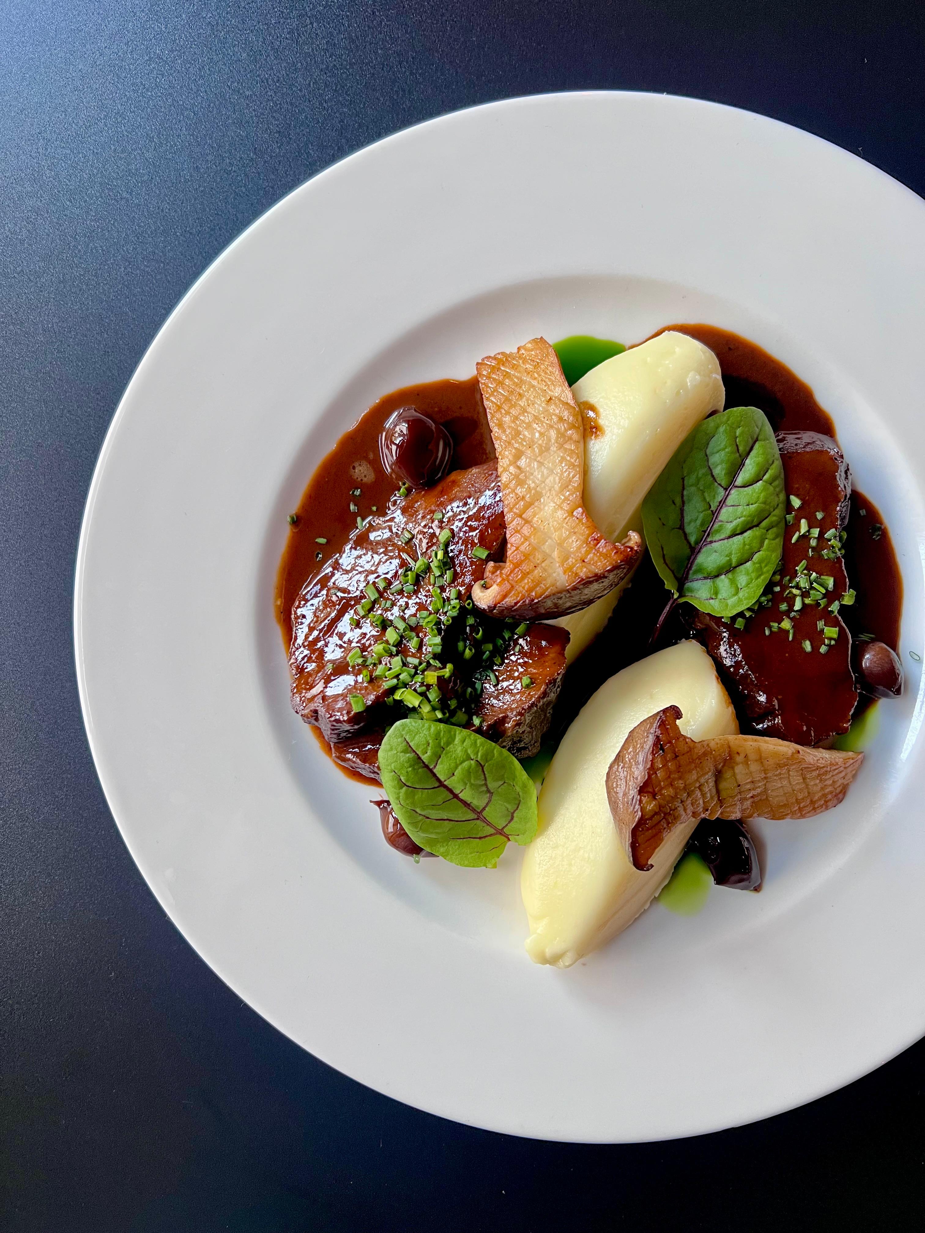 Policzek wołowy w sosie demi glace z puree ziemniaczanym, cebulkami w karmelowym balsamico i boczniakiem mikołajkowym